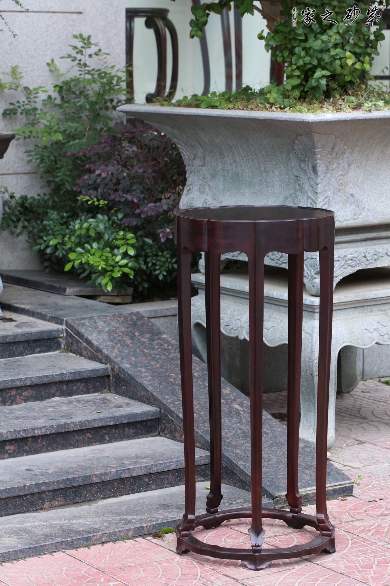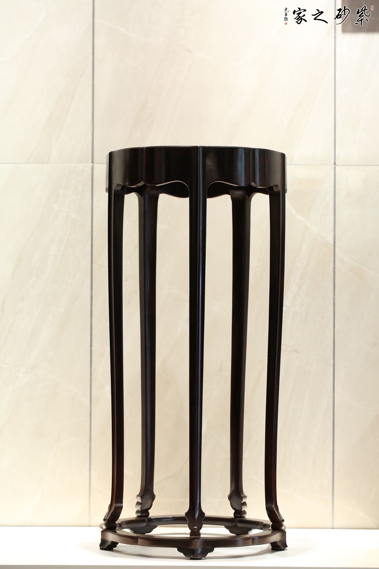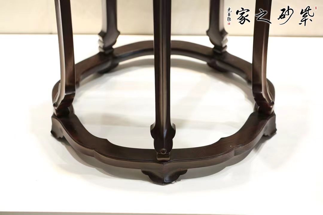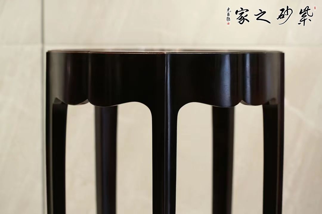 『此香几以小叶紫檀制作,几面为取菱花唐镜之形,以弧形圆材攒成圆框,秀美精致,中心打槽嵌面心,沿边起看拦水线。下有光素束腰,牙板与腿足以插肩榫相接,牙板边缘起浑厚阳线,刀法道劲有力。下承五足,三弯腿纤细灵动,至足底外翻为卷珠足,柔中带刚,下有托泥,更添稳固。整器做工考究,造型圆婉简洁,雕饰线条流畅,具有难以言说的韵味。原版 南京正大2018秋拍作品。