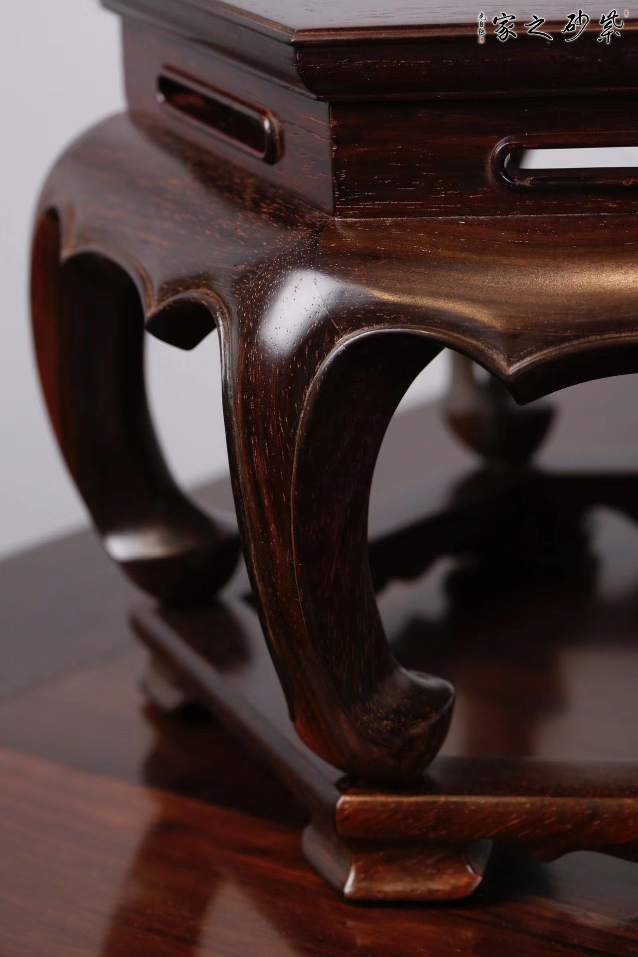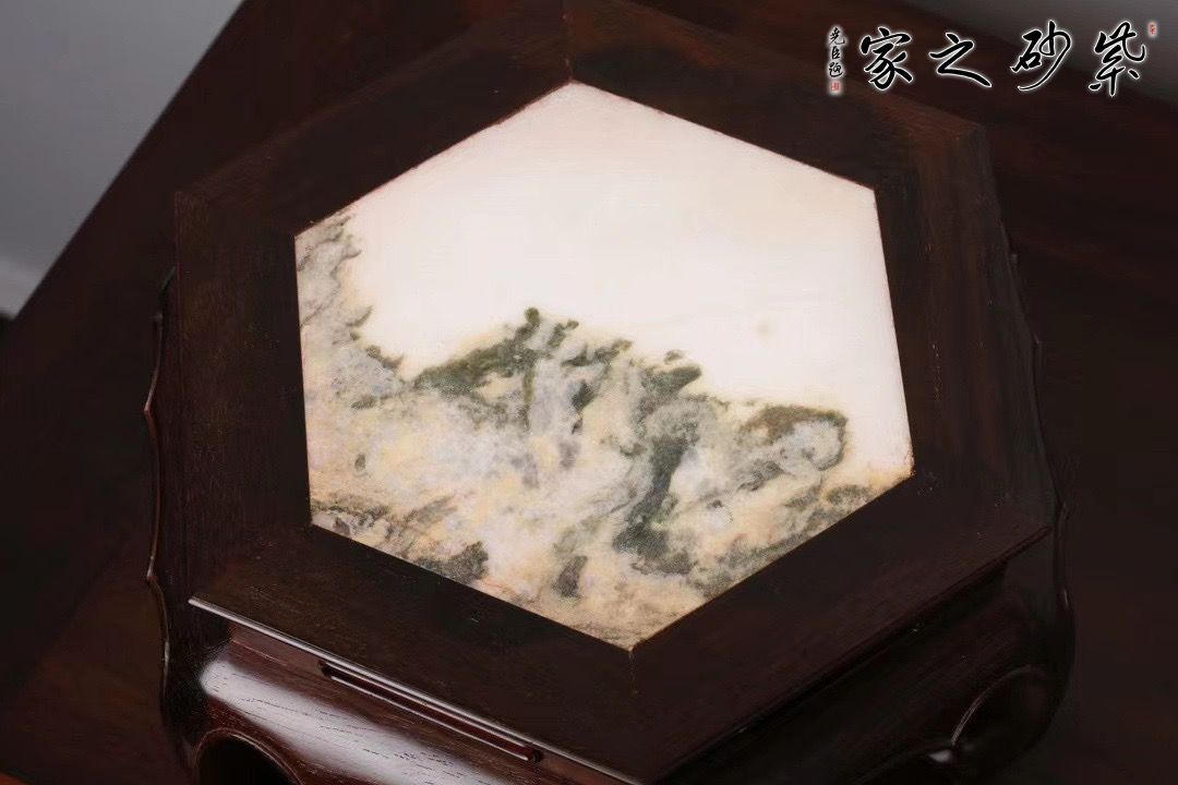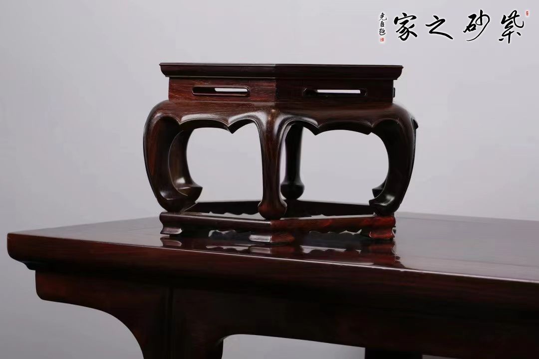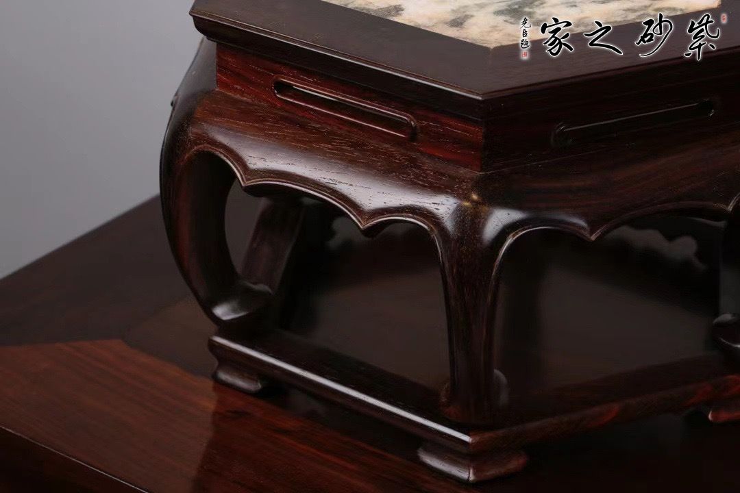 造型简洁素雅,面板六面攒边,嵌天然云石面心,榫卯严密,线条顺畅。可承托瓷器,盆景和香炉等,为屋添趣。