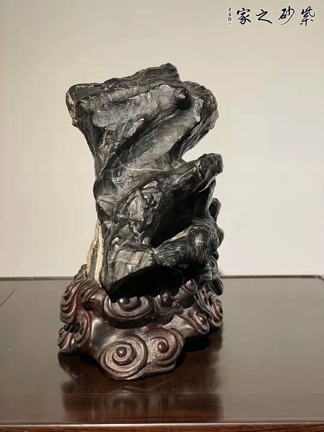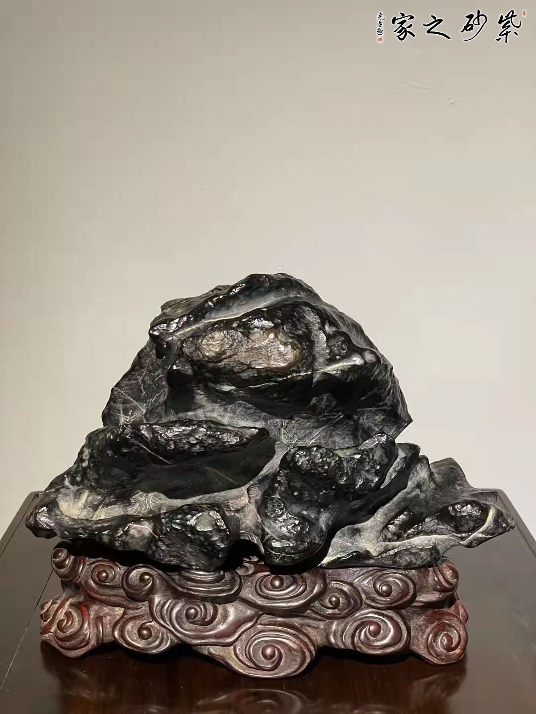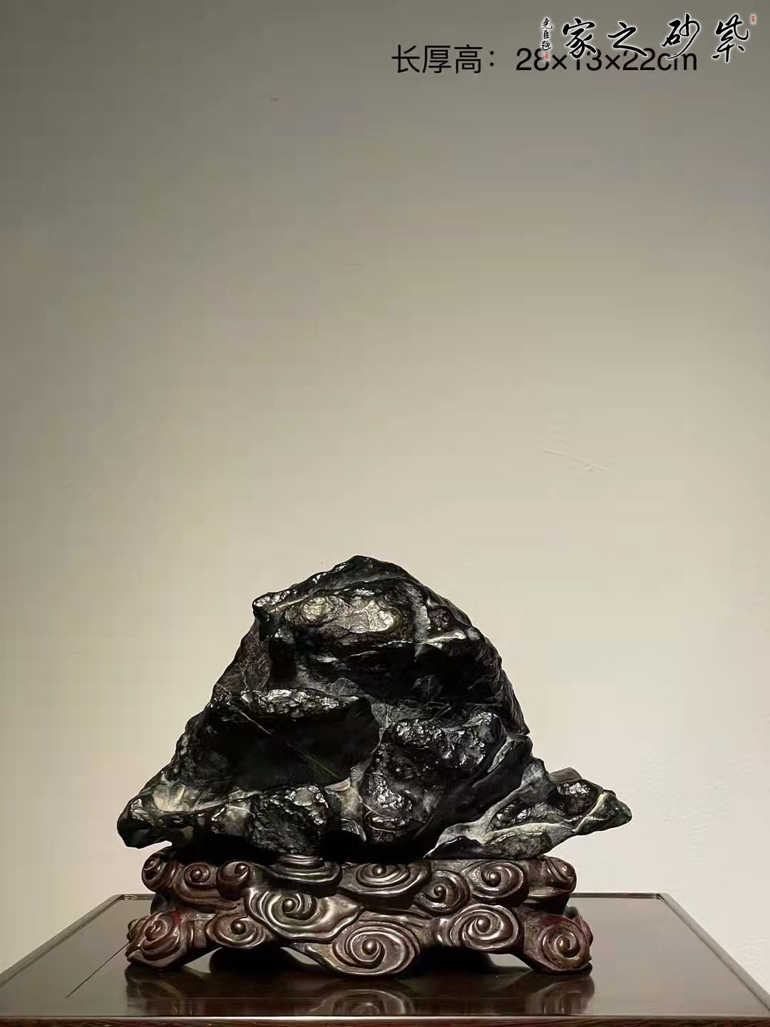 灵璧石原石,龟寿山造型,石皮皱密,皮色黑亮。石纹沟壑纵横,韵味悠长