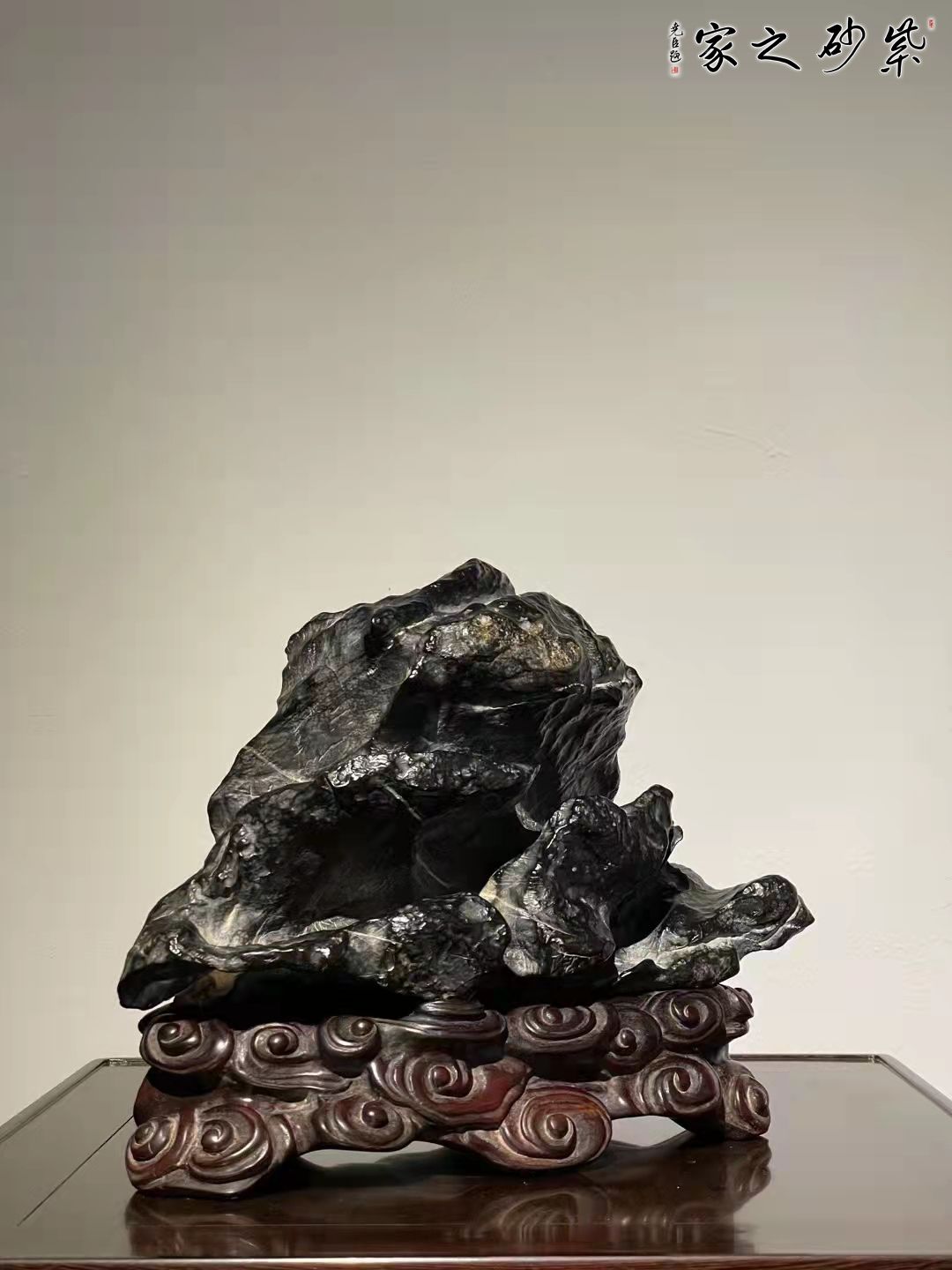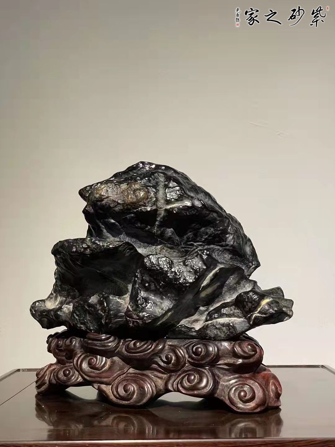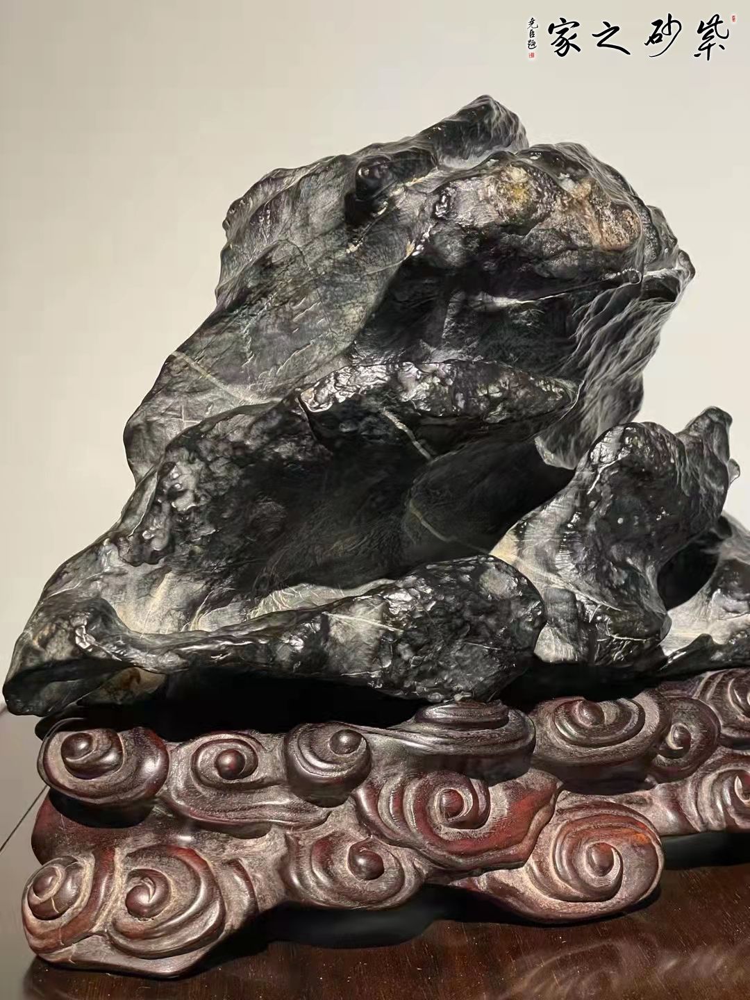 灵璧石原石,龟寿山造型,石皮皱密,皮色黑亮。石纹沟壑纵横,韵味悠长