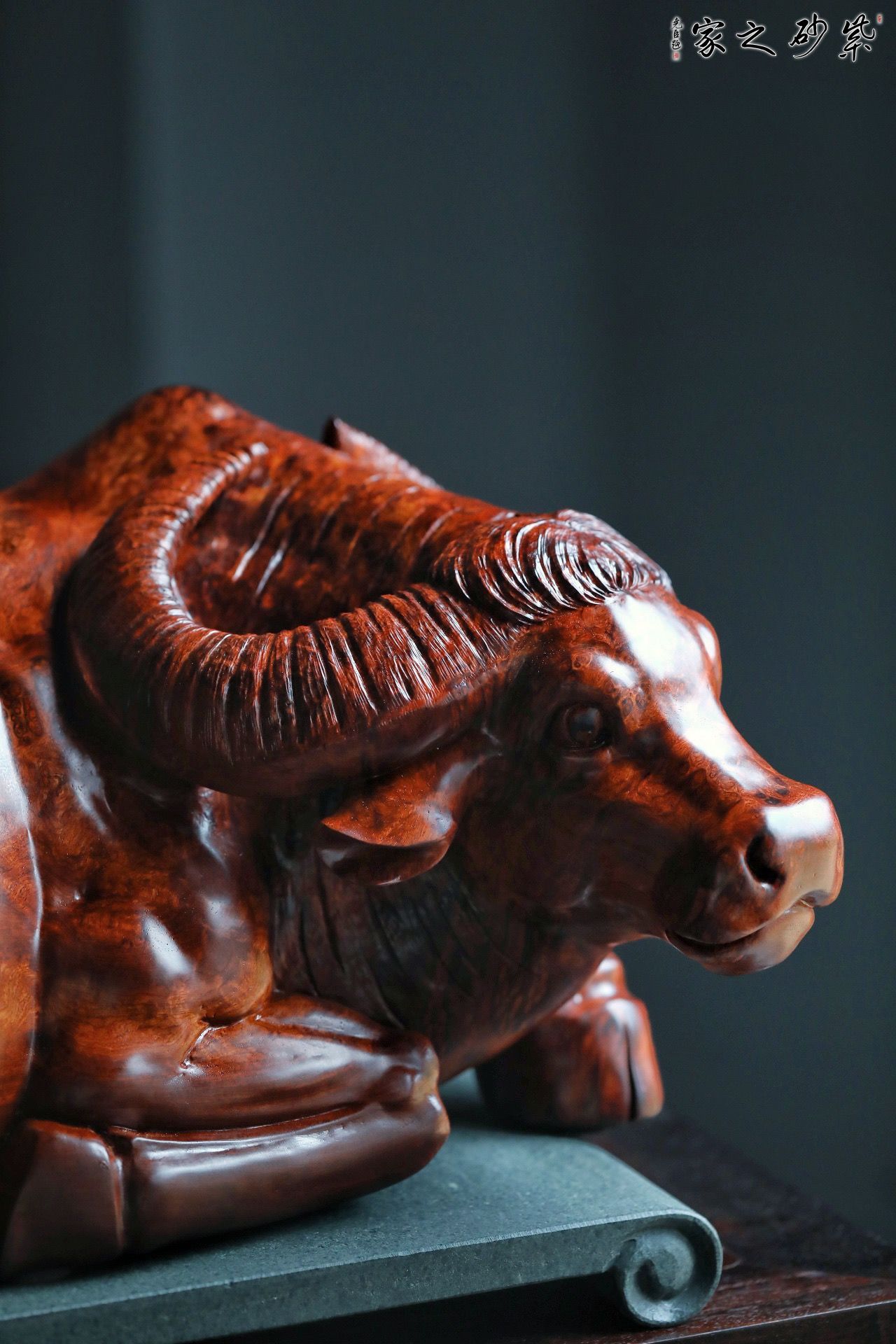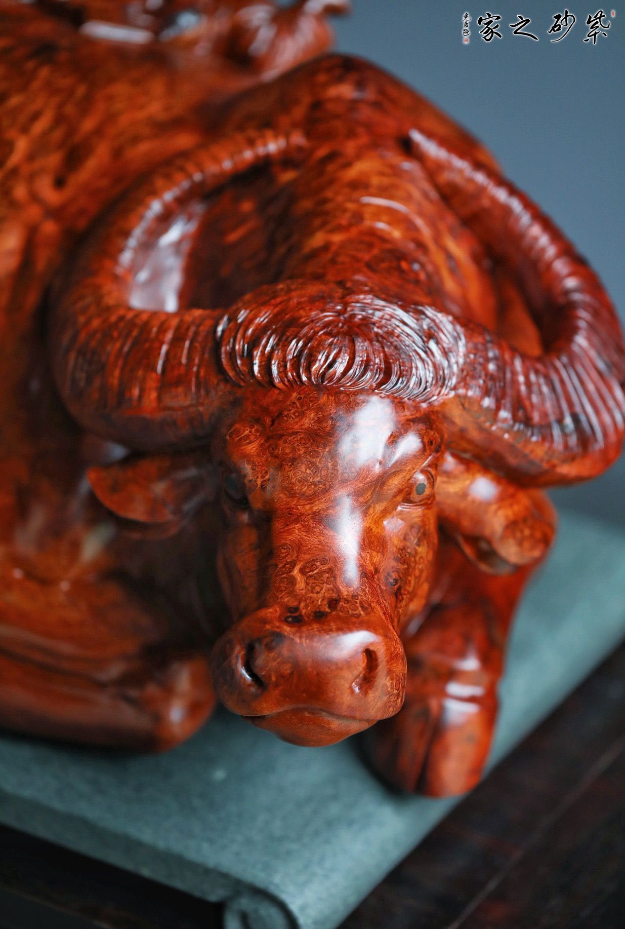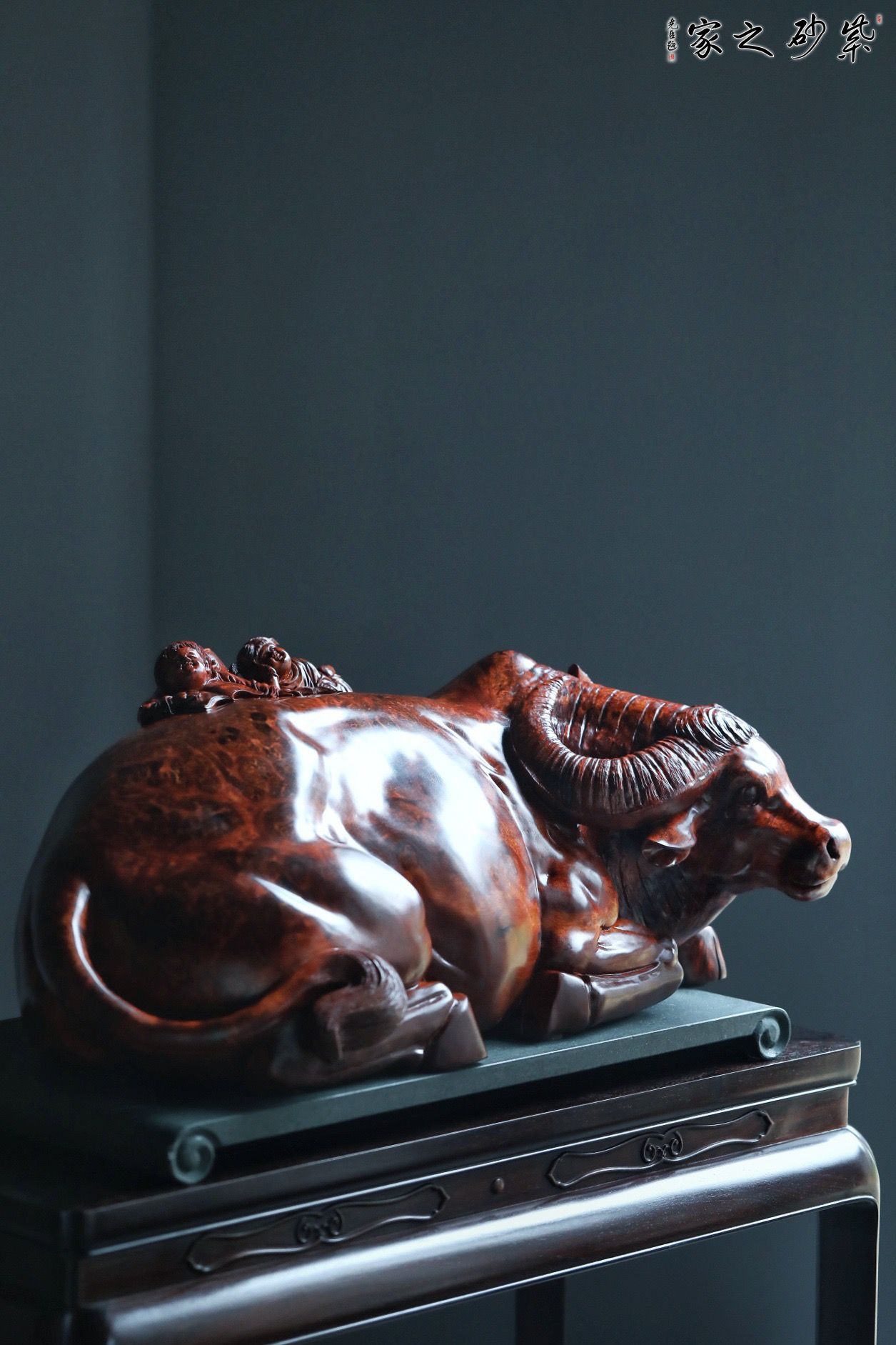 精选满瘤瘿子木,牛呈卧姿,头侧前,大眼圆睁,双角朝后弯曲,牛尾弯曲向前贴于后股,牛体肥硕健壮。牛背趴着两牧童,牛和牧童的神态十分悠闲雅致,刻画的细腻逼真。 头部背部瘿子瘤满而清晰可见。