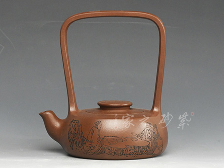 宜兴紫砂以古朴素雅、宜茶等特点呈现于世人面前,又以独特的制陶工艺、诗词、书画、篆刻相兼于一体的茶具,成为茶文化的组成部分。鉴赏宜兴紫砂壶人们通常以“泥、形、工、饰”来衡量一件紫砂作品。刘一飞老师此专业全面,设计制陶、陶刻,尤擅装饰,花鸟鱼虫、人物、山水无一不能,他主张陶刻当讲究“刀感” “笔意” 笔笔有意、刀刀见锋,所刻内容应与器皿相得益彰,又力求能与把玩者之间产生共鸣为上品,他所刻的梅、兰、菊似有暗香浮动,茗香、花香、数杆修竹又似一缕清风拂面,好不愜意。人物兼工带写生动诙谐,似能与之家长里短。山水汲古人之风,丘壑亭阁、古木参天,人与自然共存共荣,如此佳境都源于老师多年书画基础。