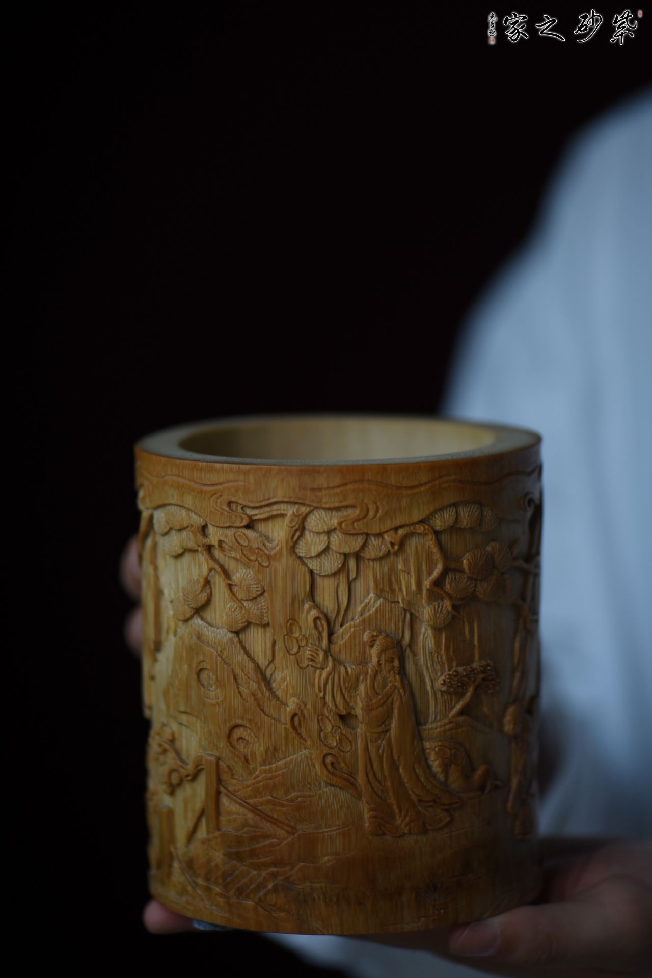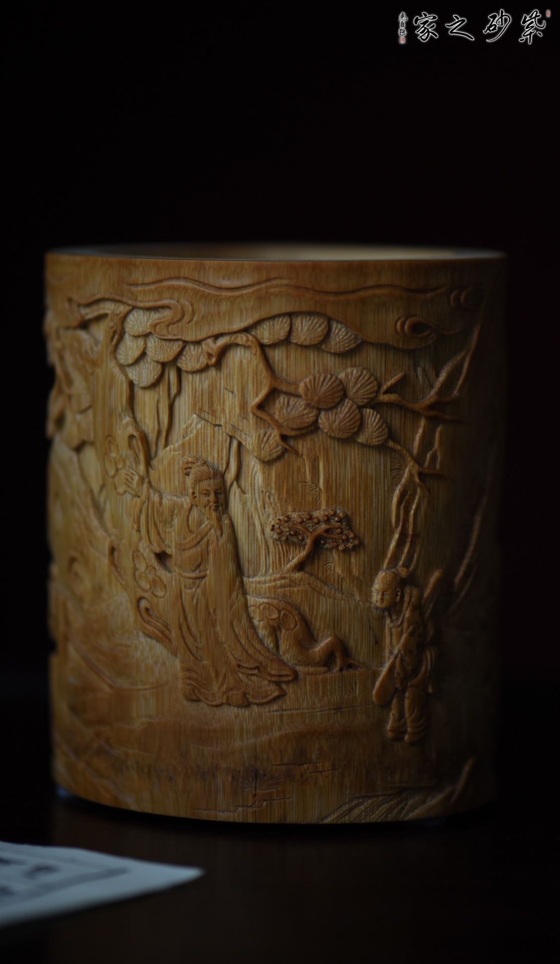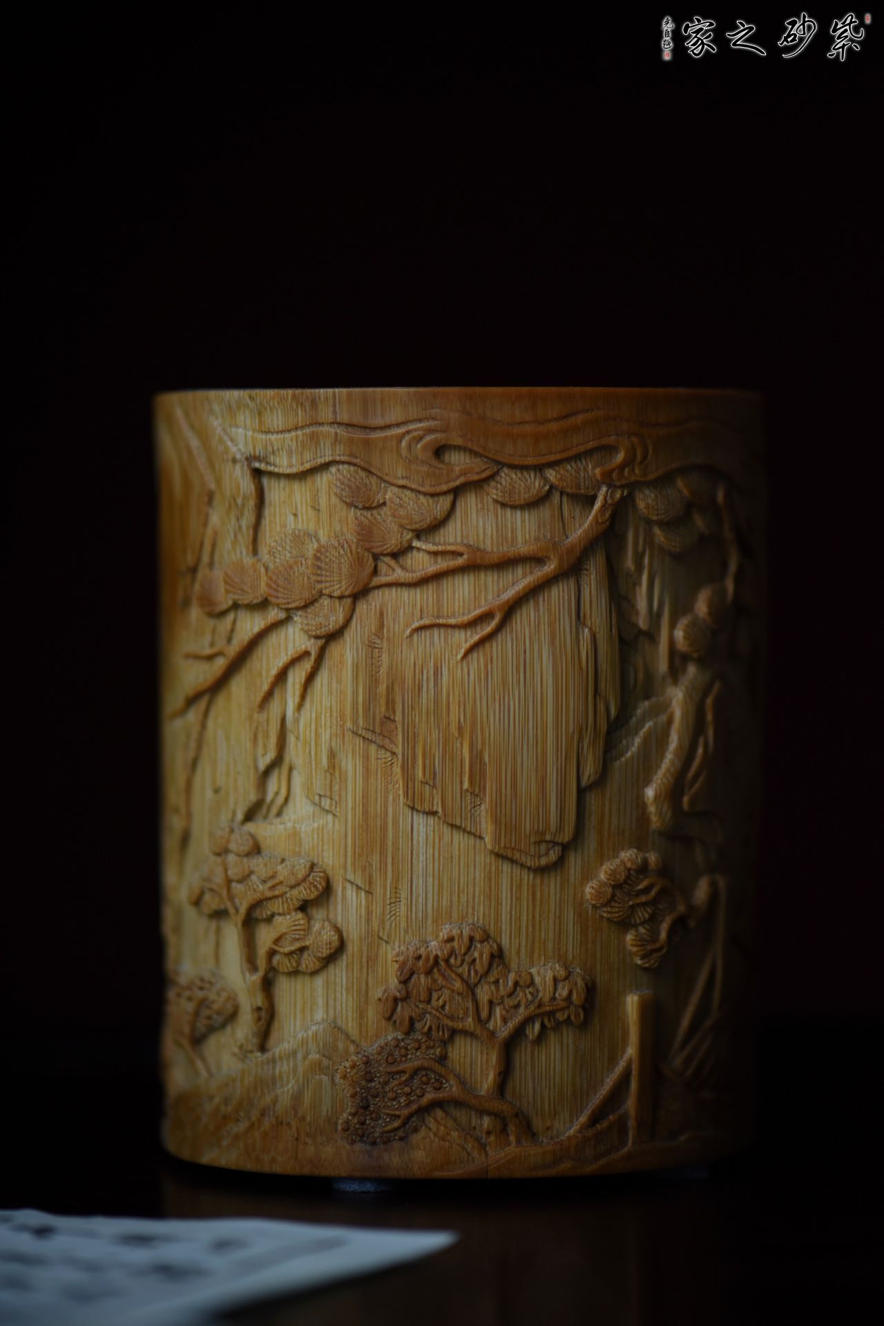 竹雕松山会友笔筒,层次分明,山峦叠嶂,松树苍劲有力,人物神情逼真,衣襟柔美飘逸。风景如画,极赋诗情画意。置书斋案几,别具风雅!