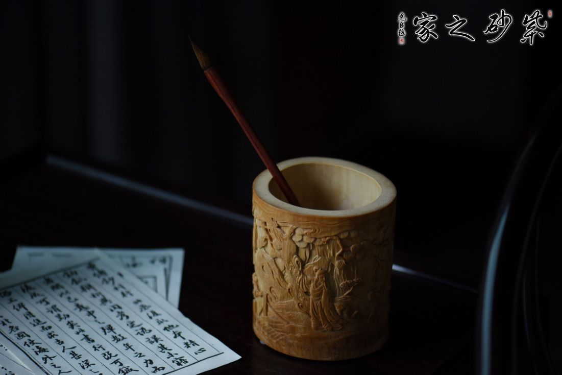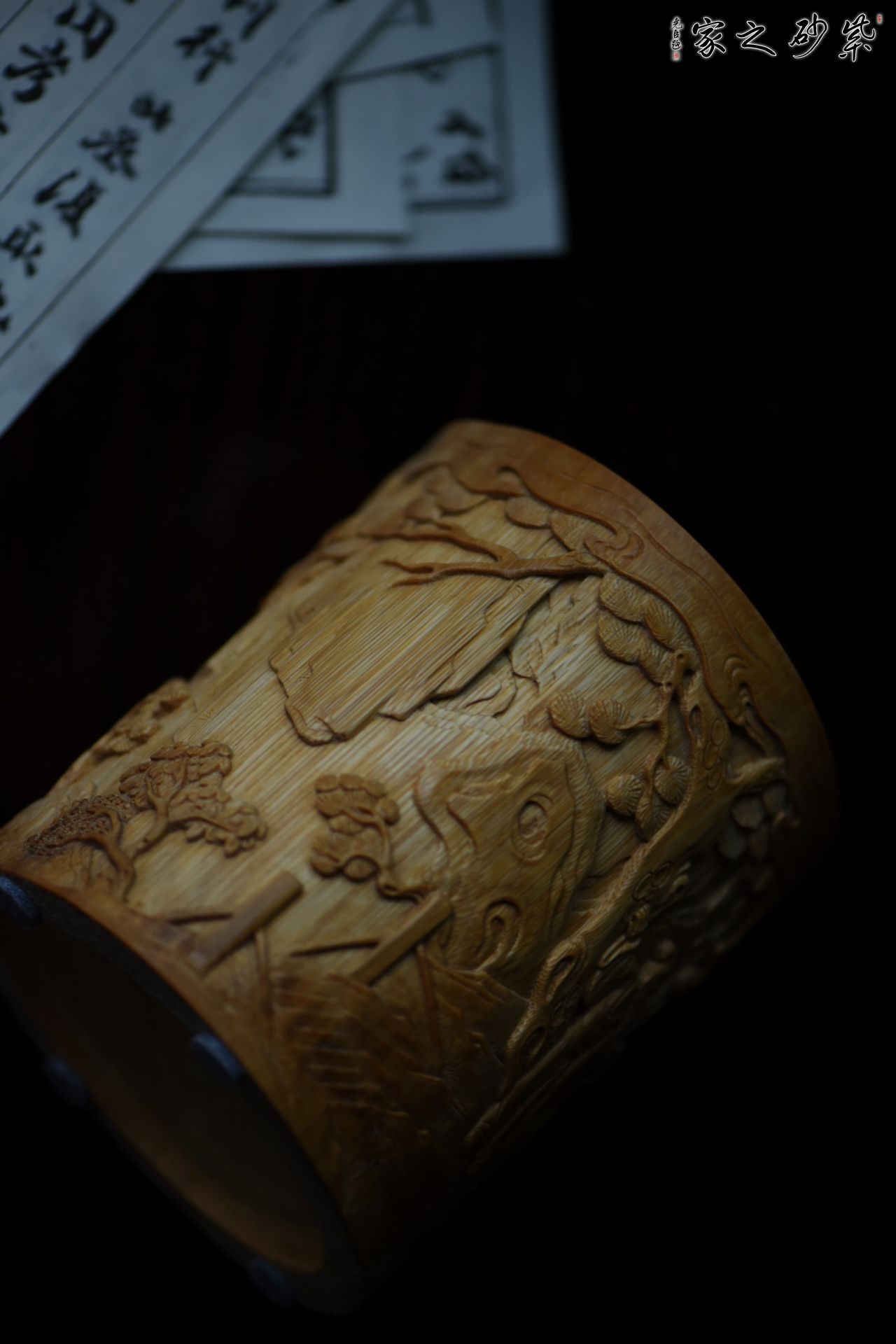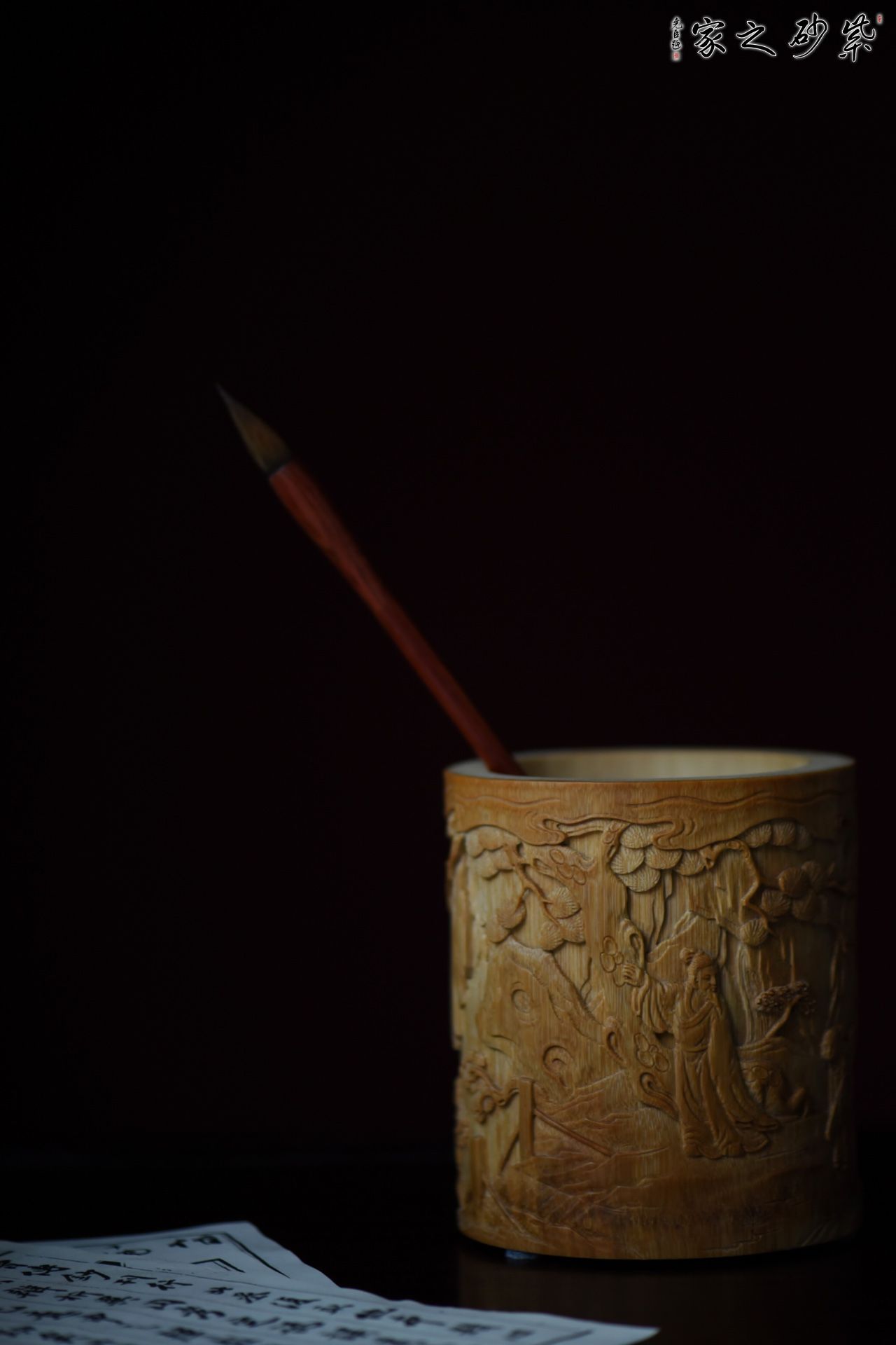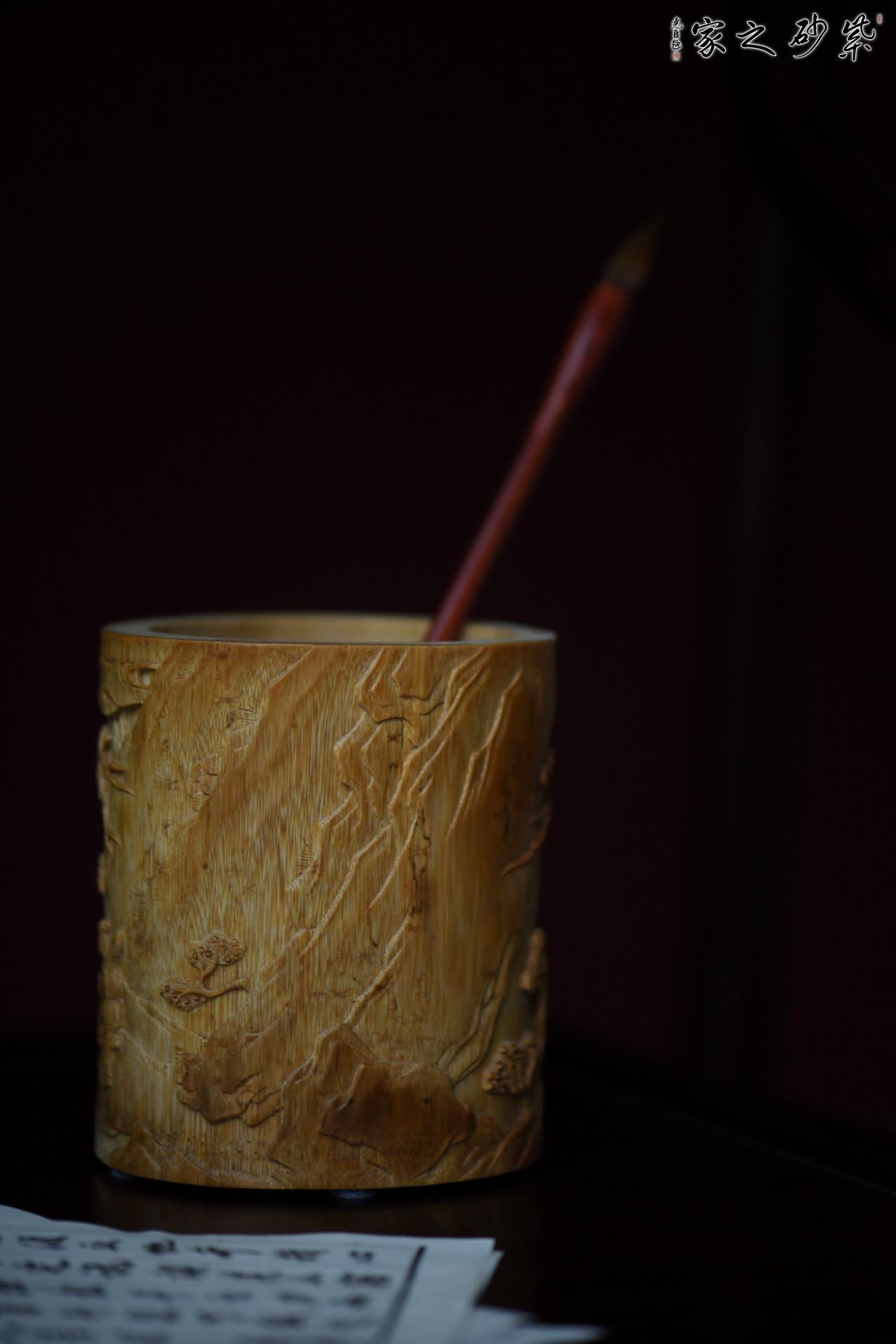 竹雕松山会友笔筒,层次分明,山峦叠嶂,松树苍劲有力,人物神情逼真,衣襟柔美飘逸。风景如画,极赋诗情画意。置书斋案几,别具风雅!
