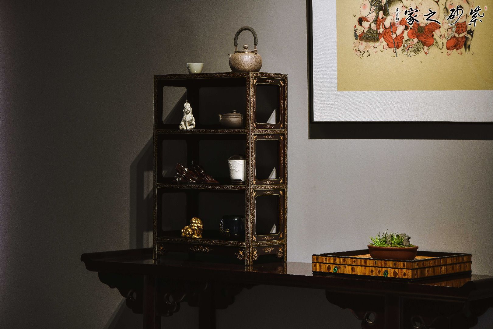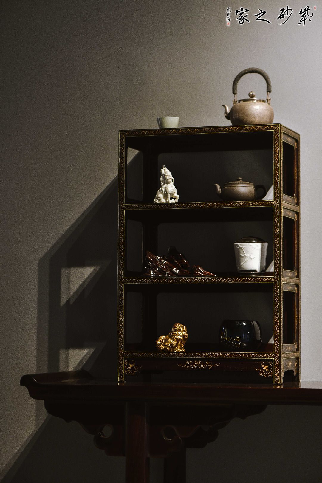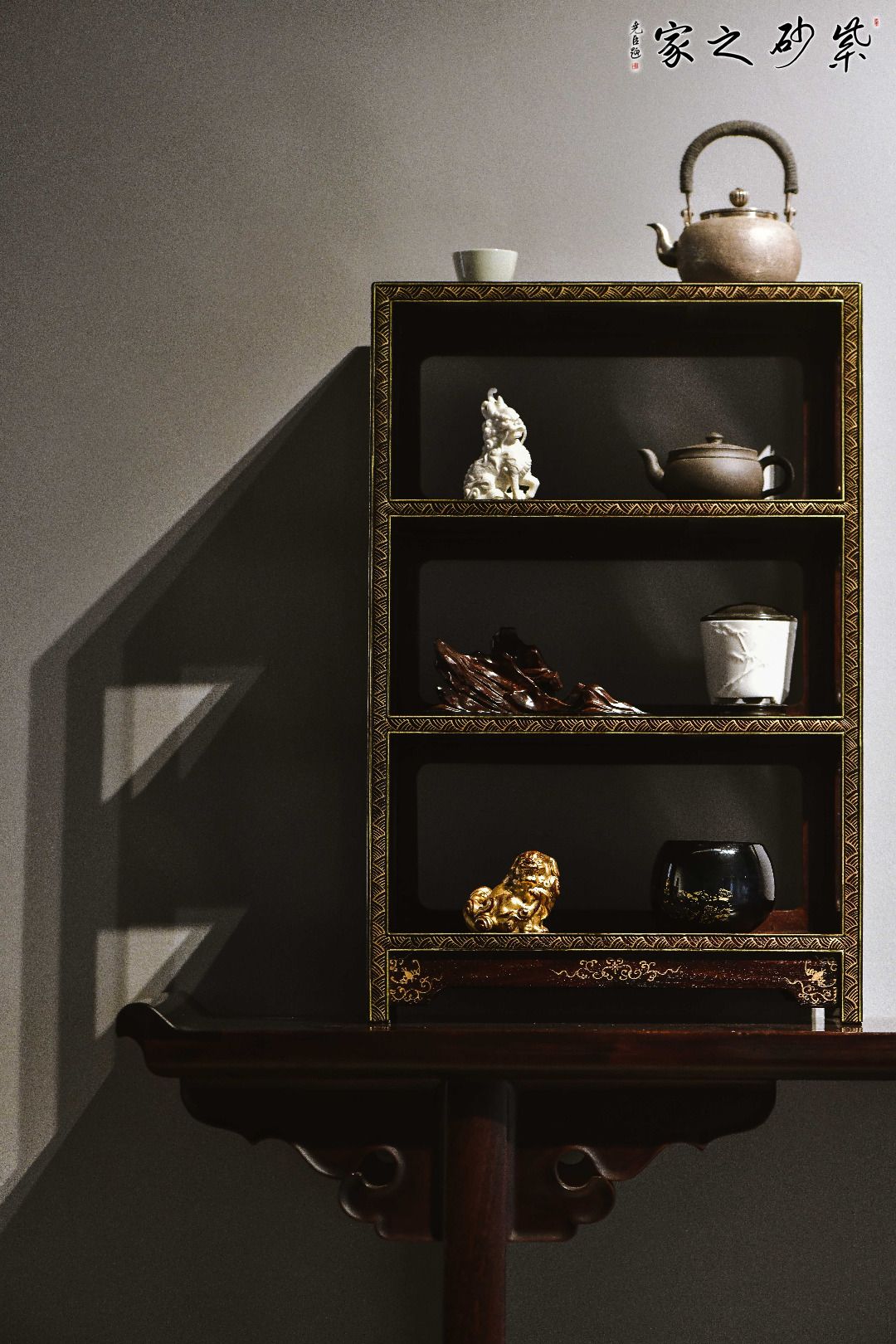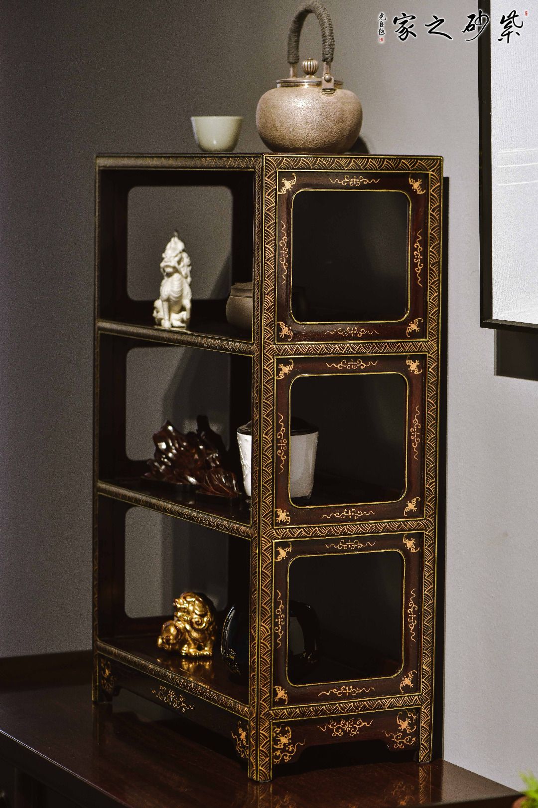 由明式经典款改制,架格方材,打洼,踩委角线,上下三层全敞开式架格,四面窗格牙子攒成,正/侧髹绘云纹,简中有序,润同和璧,优雅治艳,茶事置器,文房置书,花事置雅