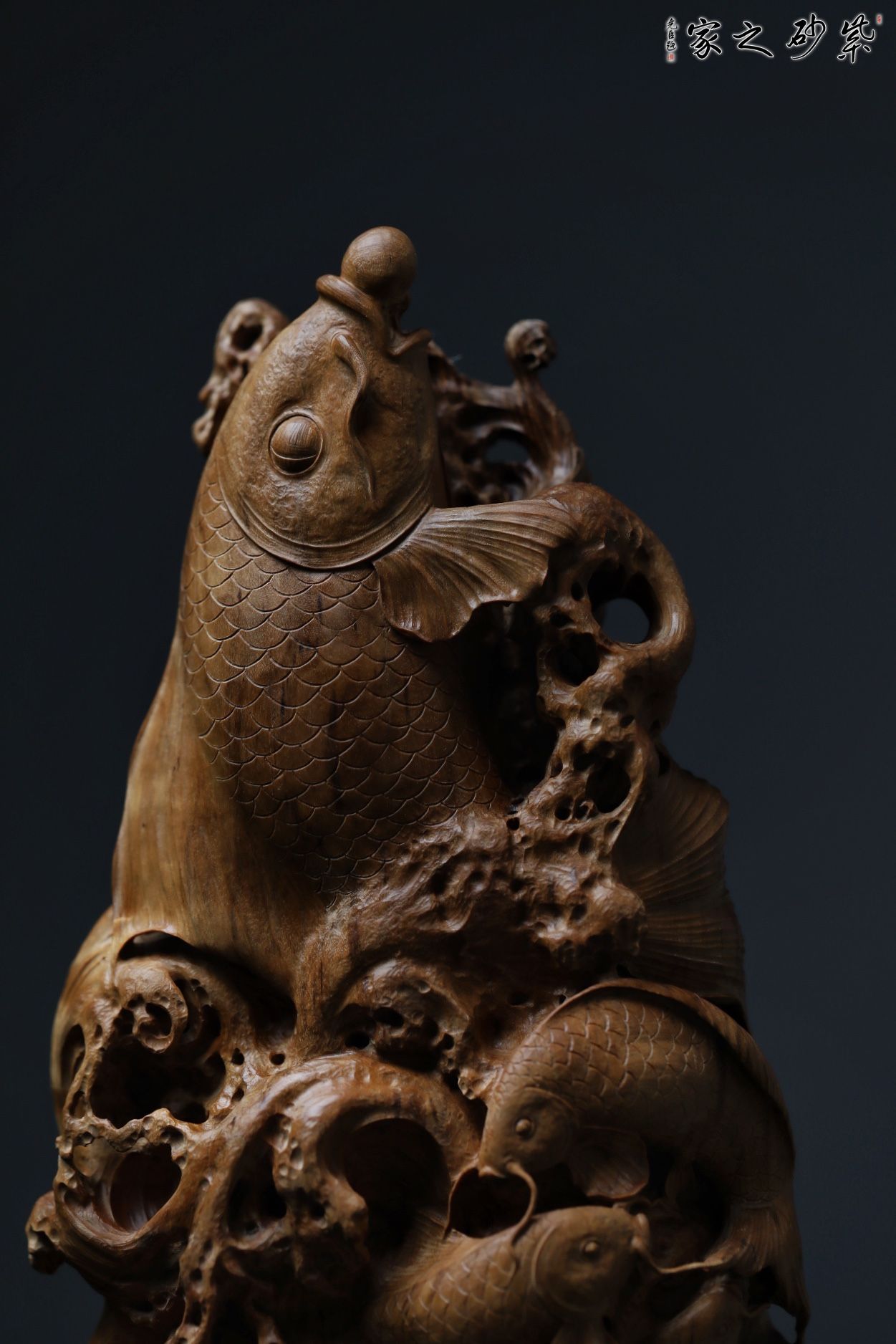 老山檀香整料手刻,九条鲤鱼相争上游,栩栩如生,背面天然皮沙巧雕。实属难得佳品