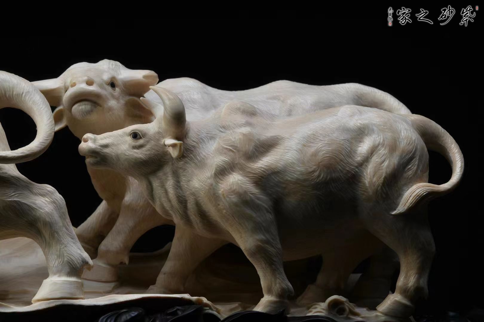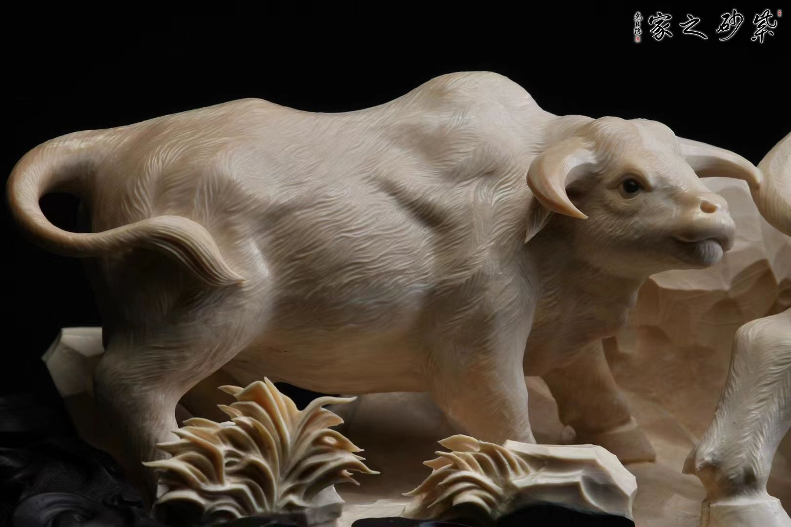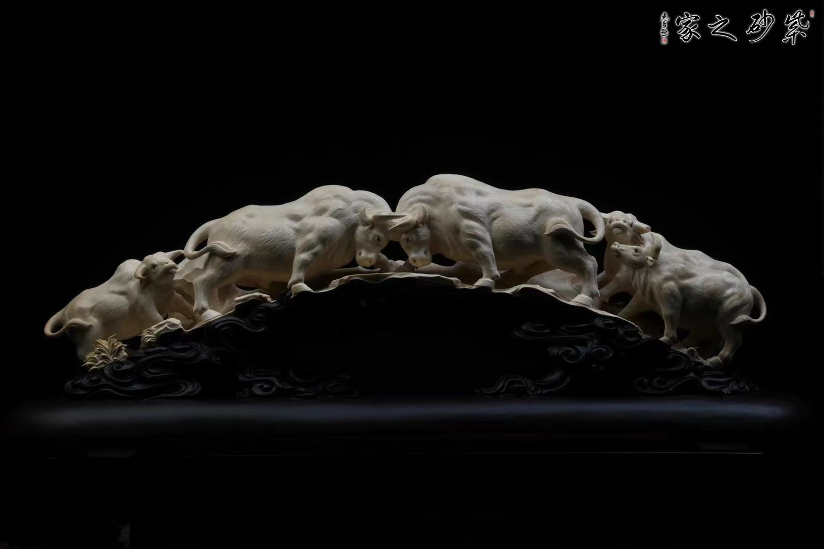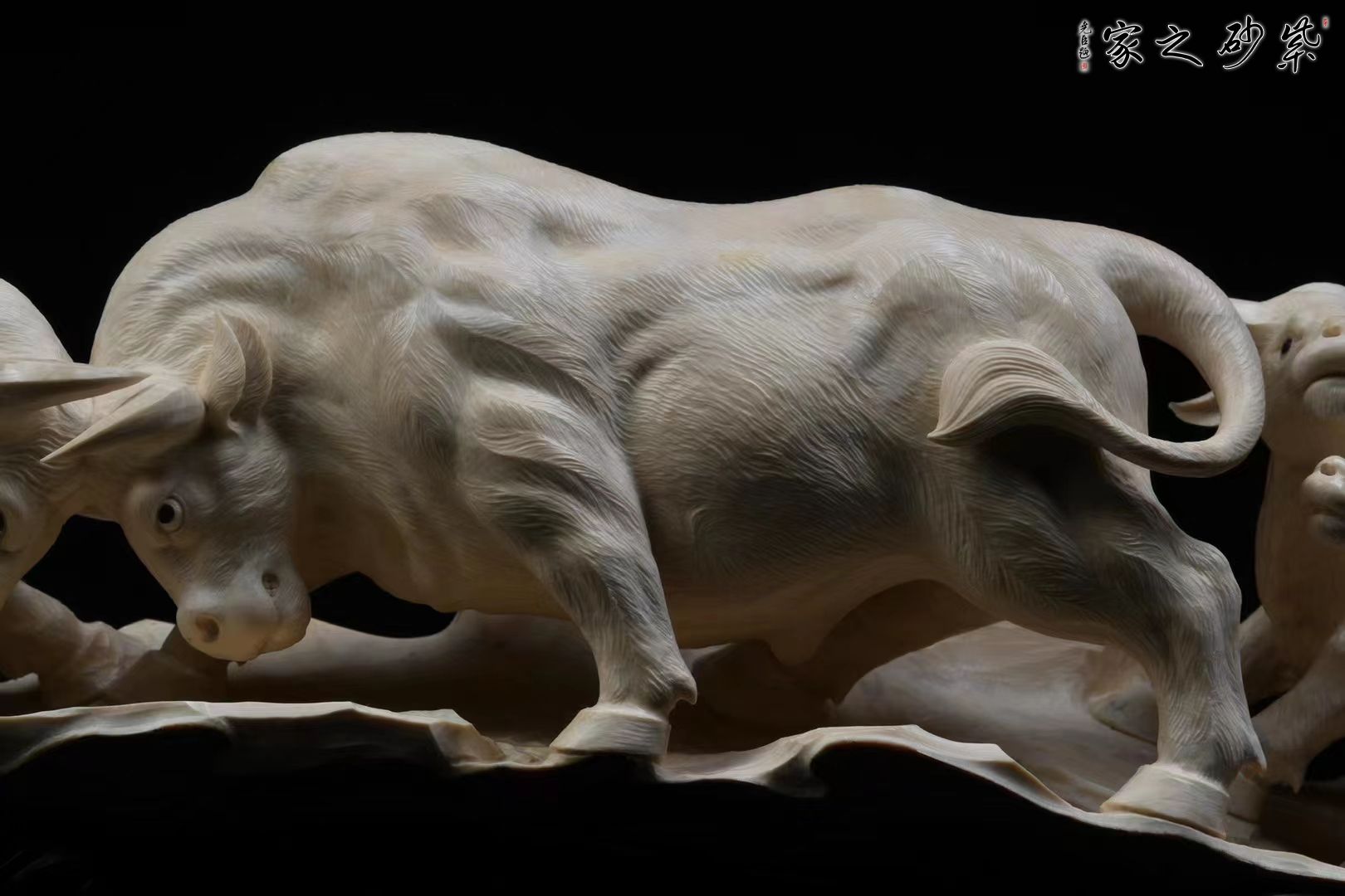 作品以5A雕刻,五头牛从左至右一字排开,各具状貌,姿态互异。整幅作品别无其他衬景,因此每头牛可独立成章。在技巧表现上,作者更是独具匠心,选择了粗壮有力、具有块面感的线条去表现牛的强健、有力、沉稳而行动迟缓。其线条有排比装饰之效却又不落俗套,而是刻力千钧。由于其线条茁壮如此,故而五牛姿态虽有平、奇之不同,但在审美趣味上是同样的厚重与生拙。