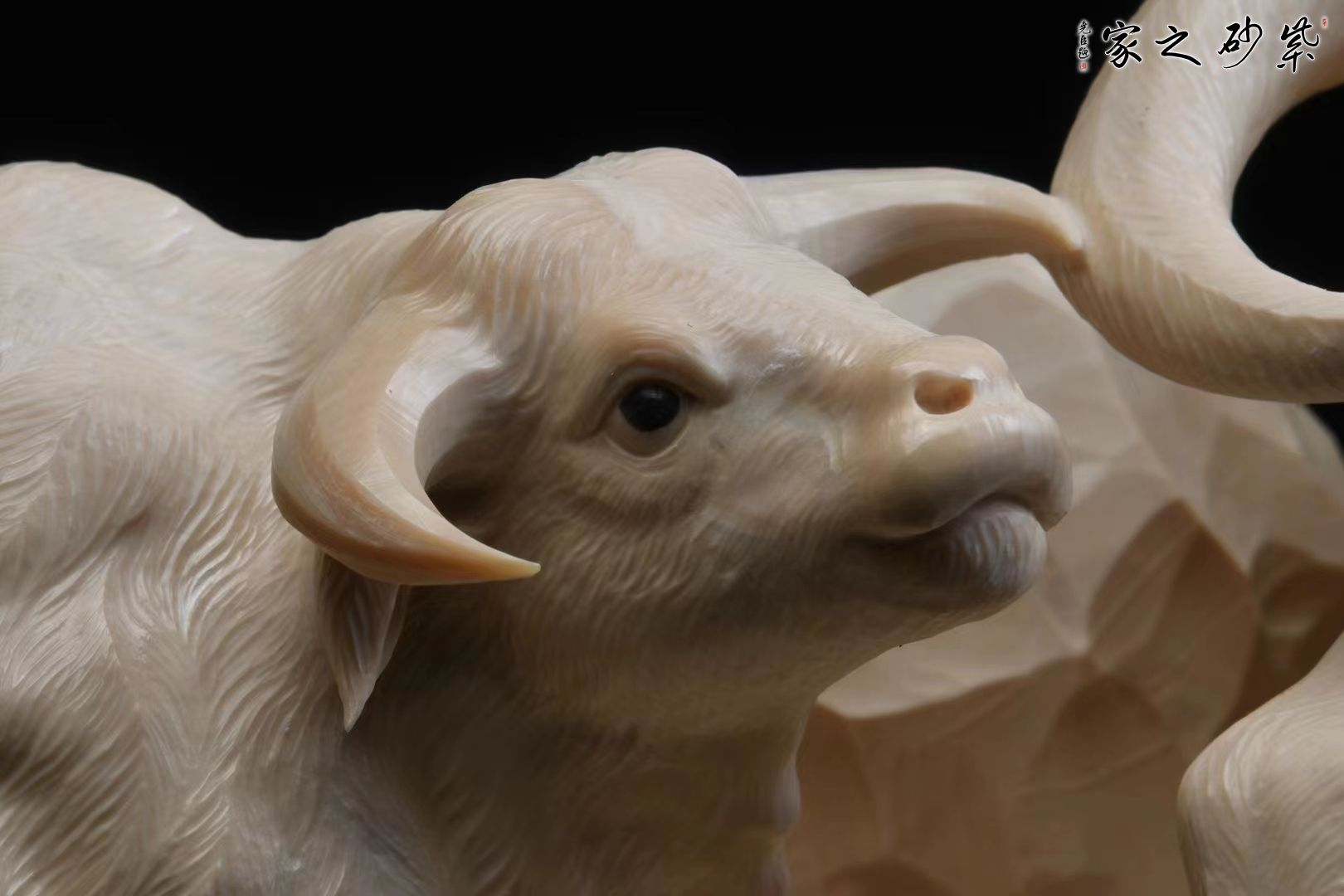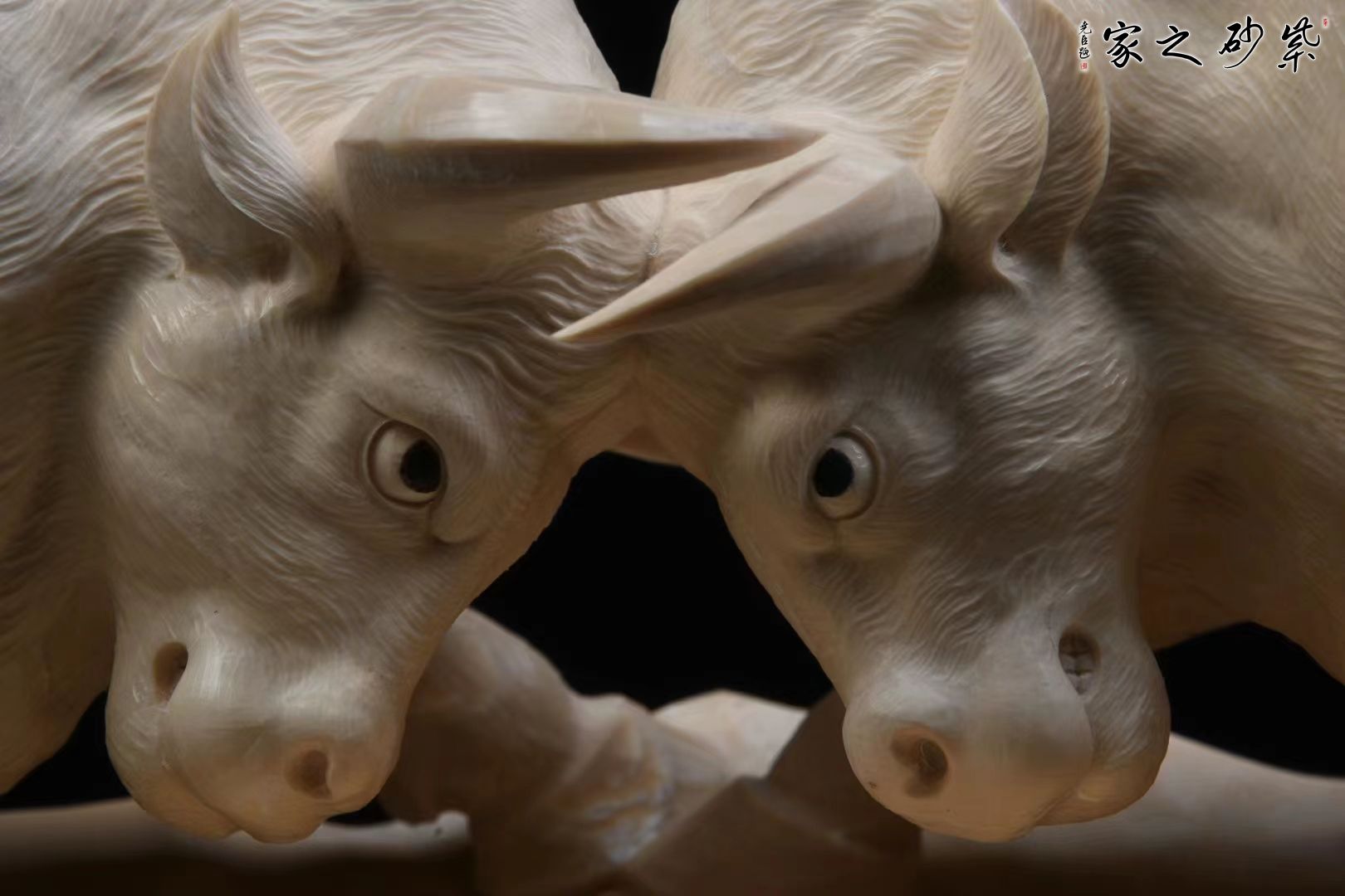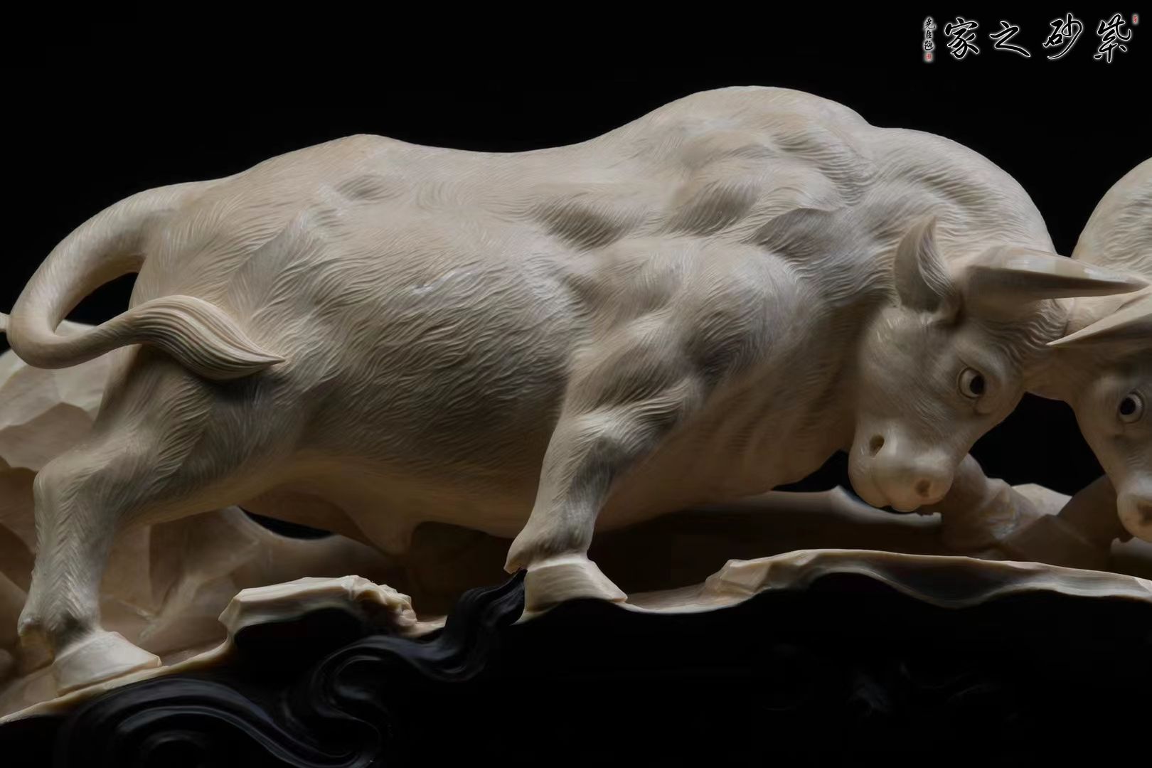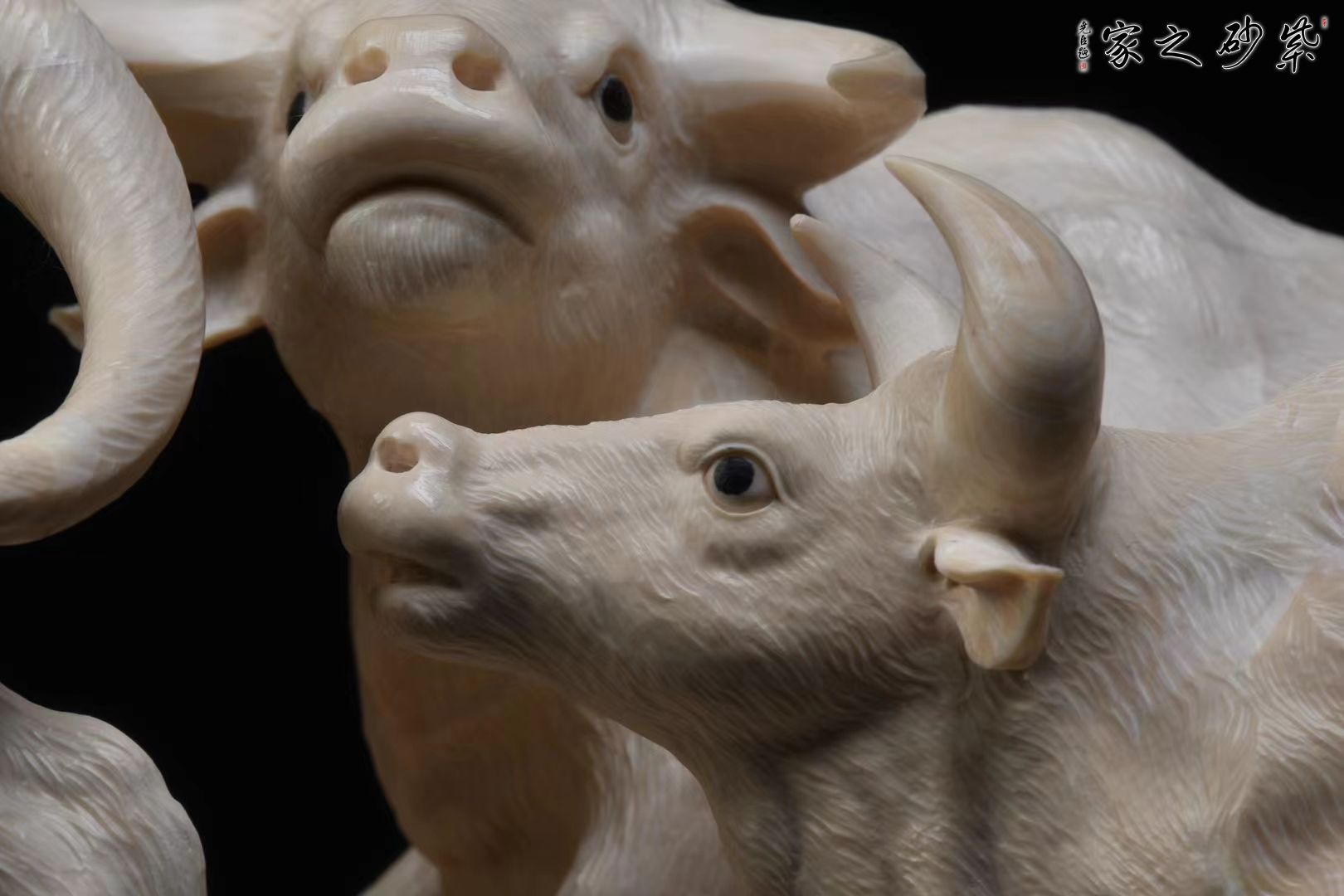 作品以5A雕刻,五头牛从左至右一字排开,各具状貌,姿态互异。整幅作品别无其他衬景,因此每头牛可独立成章。在技巧表现上,作者更是独具匠心,选择了粗壮有力、具有块面感的线条去表现牛的强健、有力、沉稳而行动迟缓。其线条有排比装饰之效却又不落俗套,而是刻力千钧。由于其线条茁壮如此,故而五牛姿态虽有平、奇之不同,但在审美趣味上是同样的厚重与生拙。
