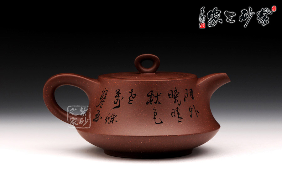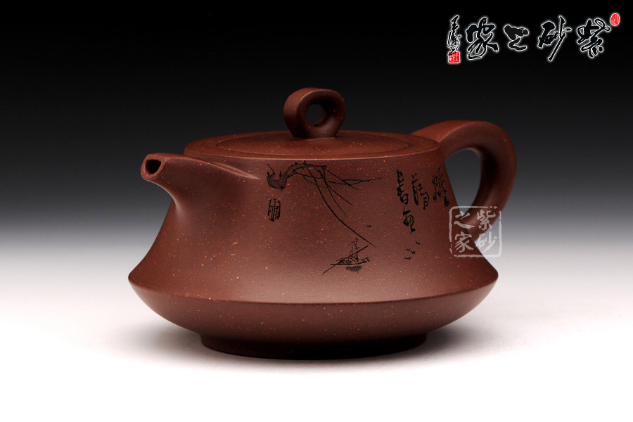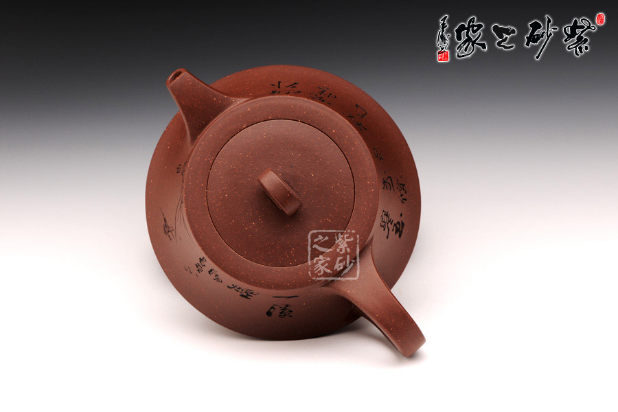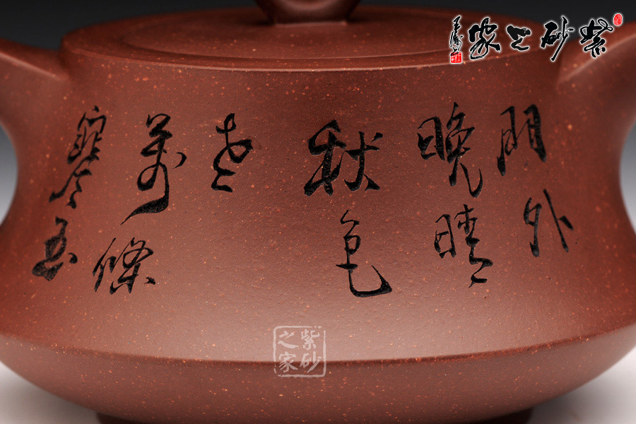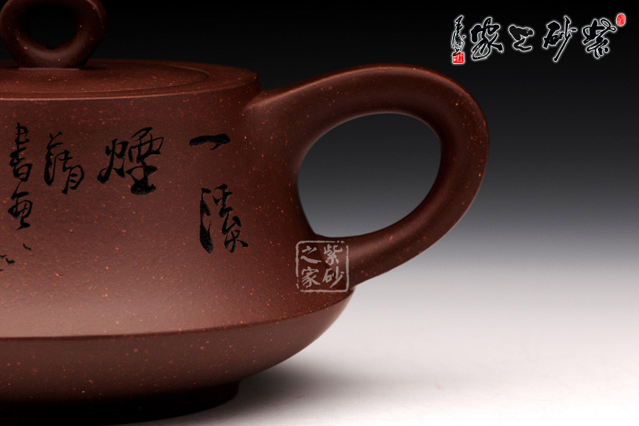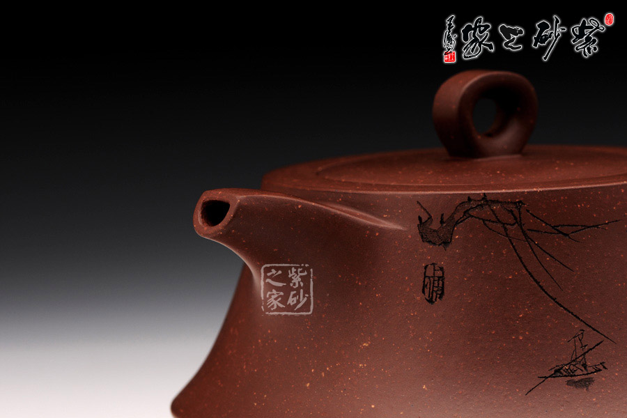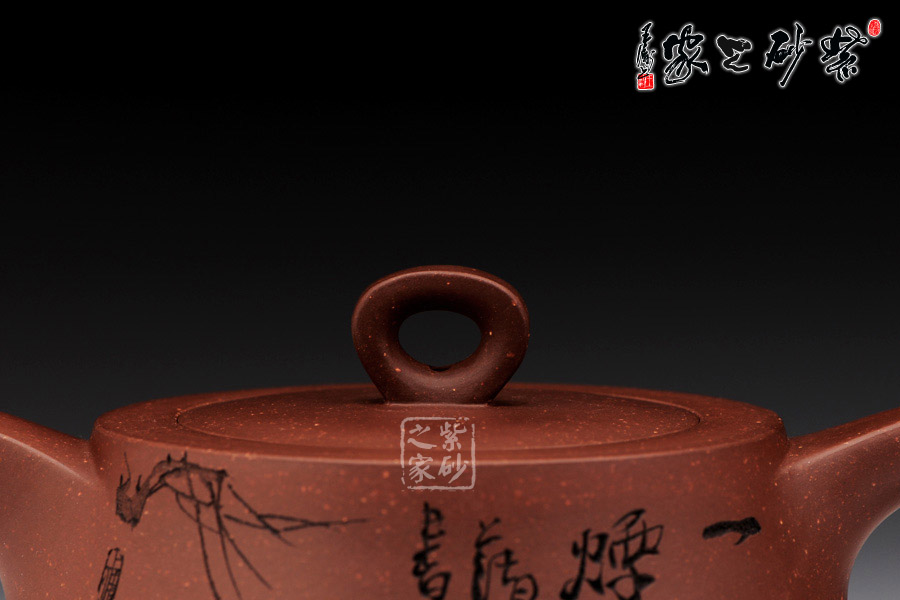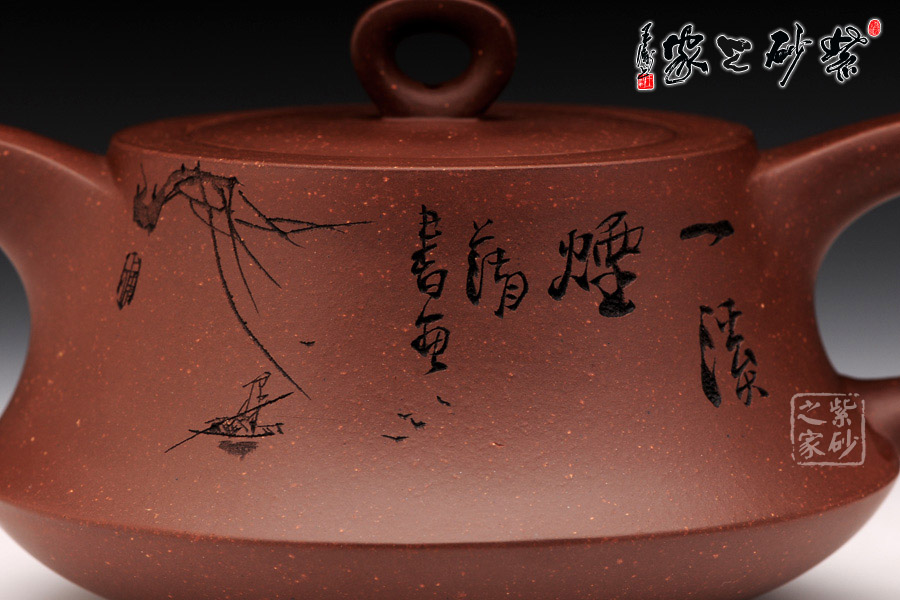 壶身的装饰由著名陶刻艺人厉上清操刀,厉上清,师从工艺美术大师谭泉海、鲍志强,篆刻功底深厚,深受热捧,篆刻笔法高古冷逸,这款作品壶身正面篆刻的是山水之境,且刻有湖面轻舟过,飞鸟掠于水面,一只硕大的树影自岸边伸向水面,似是仙境;壶身反面篆刻的是“门外晚晴秋色老,万条寒玉一溪烟”,此诗出自唐代诗人雍陶的作品《韦处士郊居》。