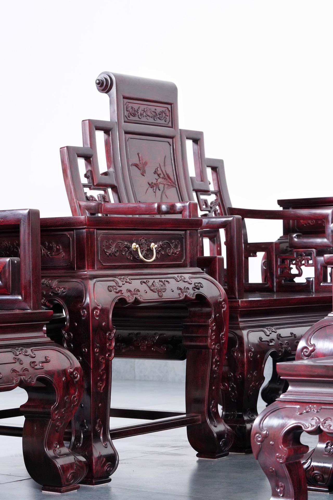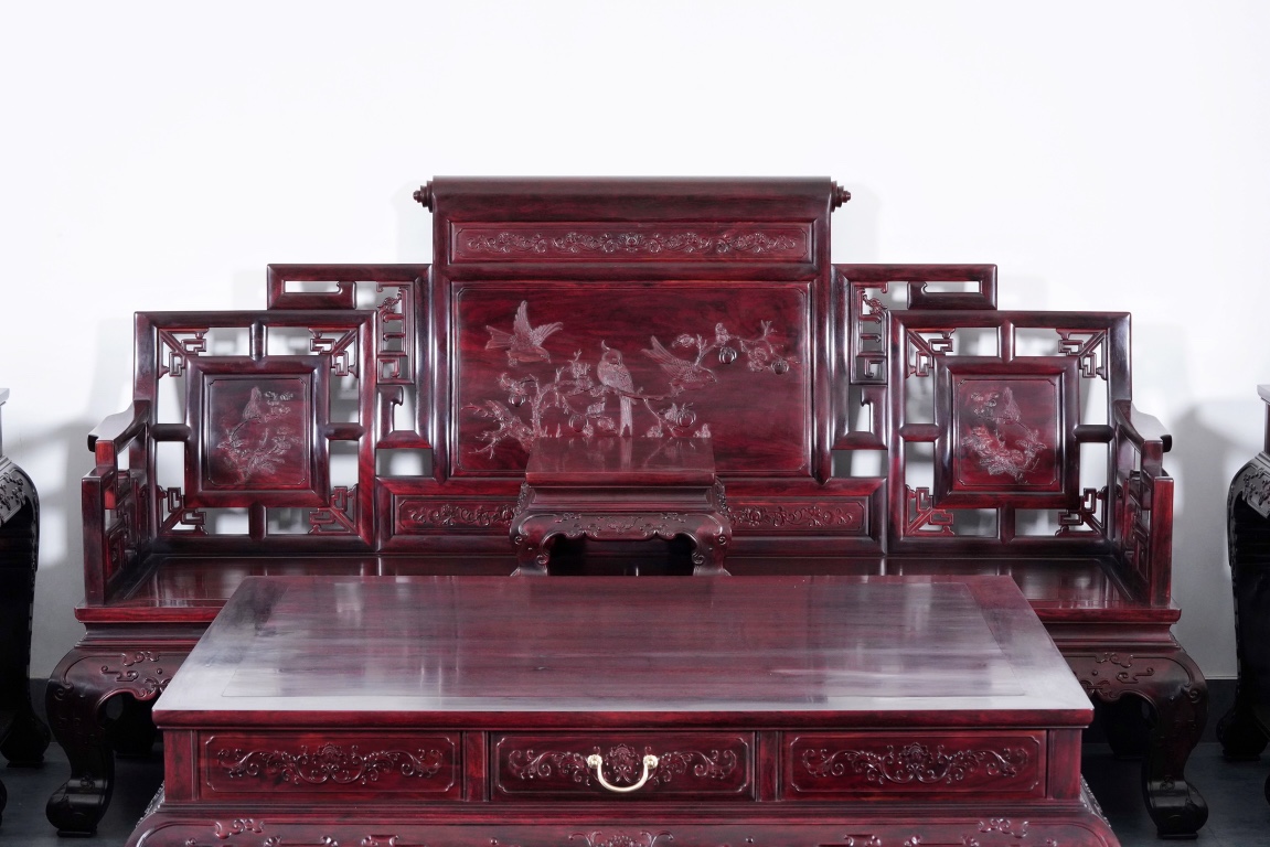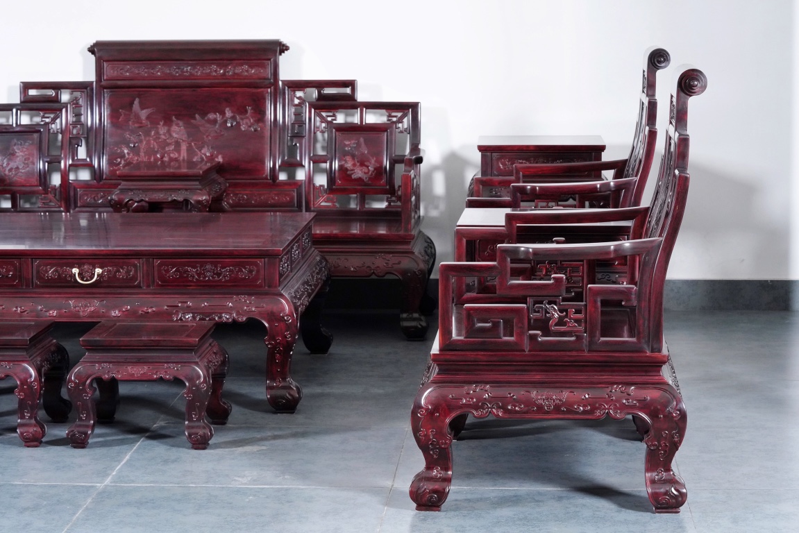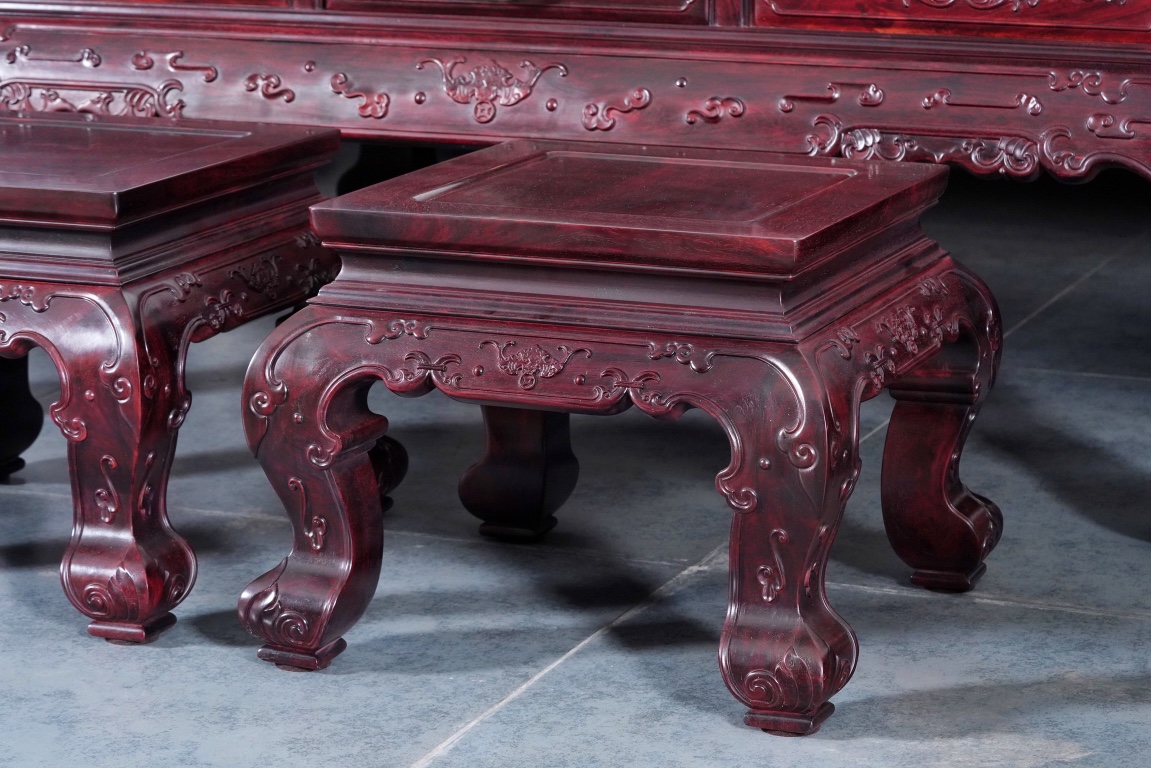 印度小叶紫檀 卷书弯背沙发(喜事连连),做工精细,材质优良,尊贵优雅,性价比超高。尺寸如下:单人座:86*62*115 三人座:198*62*115 小茶几:58*48*64 大茶几:128*108*53 花架 :50*50*50 亢几: 50*34*25 凳子: 36*36*35