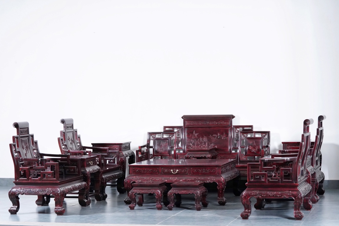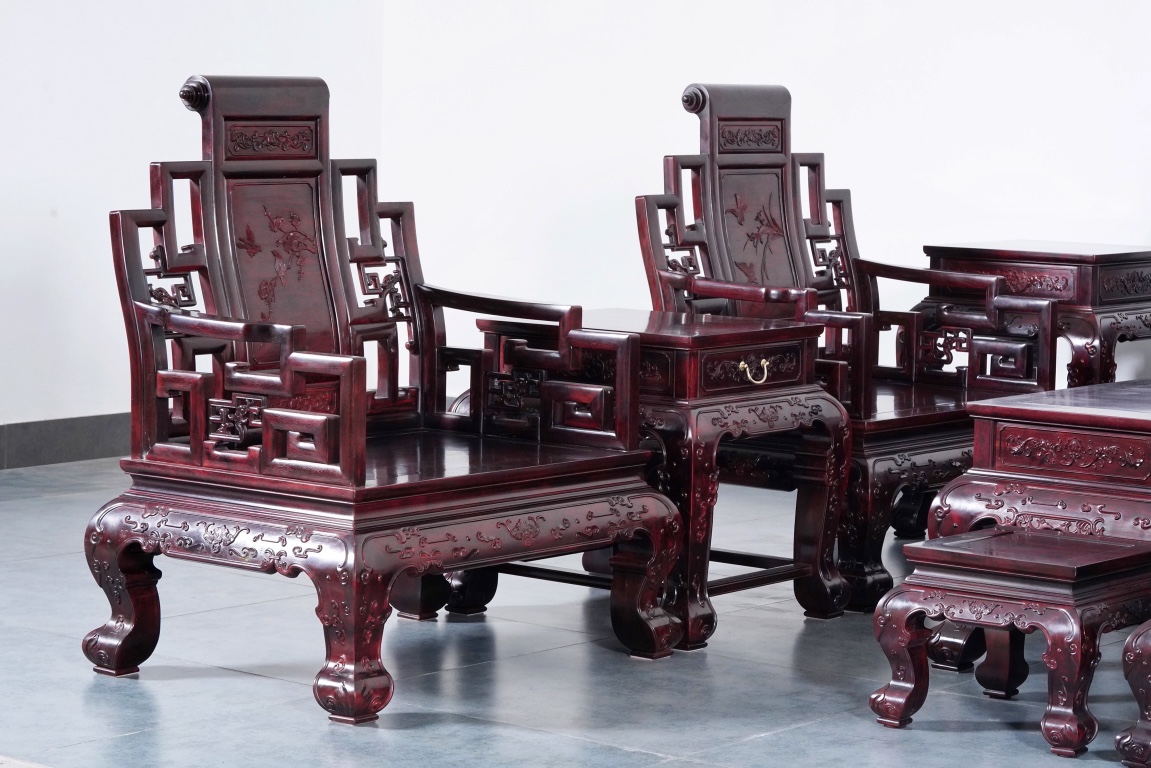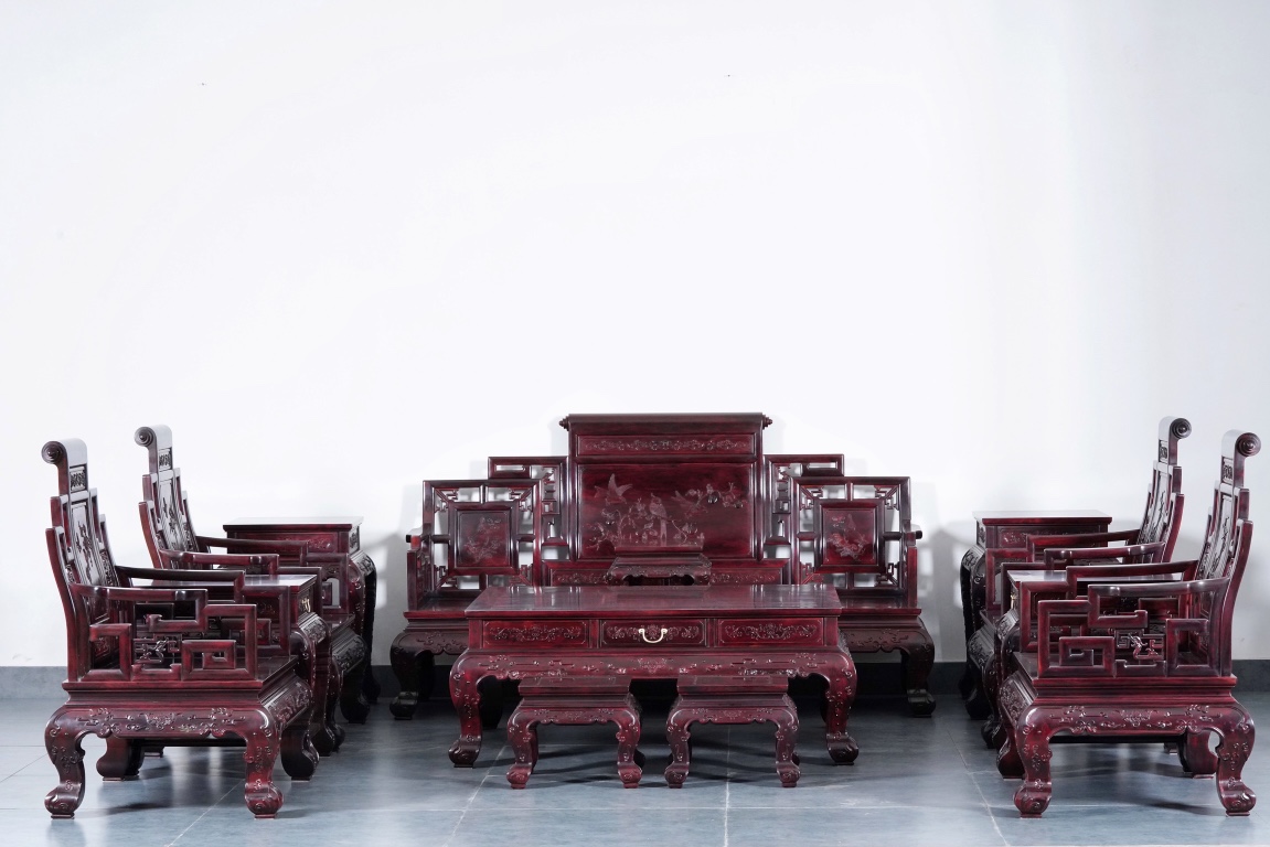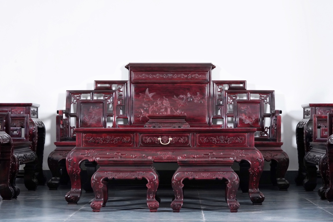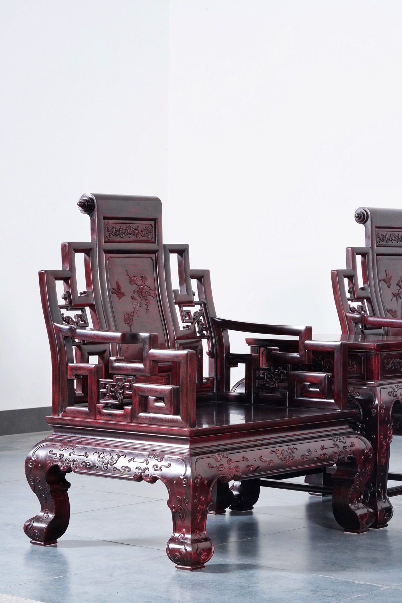 印度小叶紫檀 卷书弯背沙发(喜事连连),做工精细,材质优良,尊贵优雅,性价比超高。尺寸如下:单人座:86*62*115 三人座:198*62*115 小茶几:58*48*64 大茶几:128*108*53 花架 :50*50*50 亢几: 50*34*25 凳子: 36*36*35