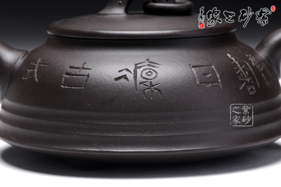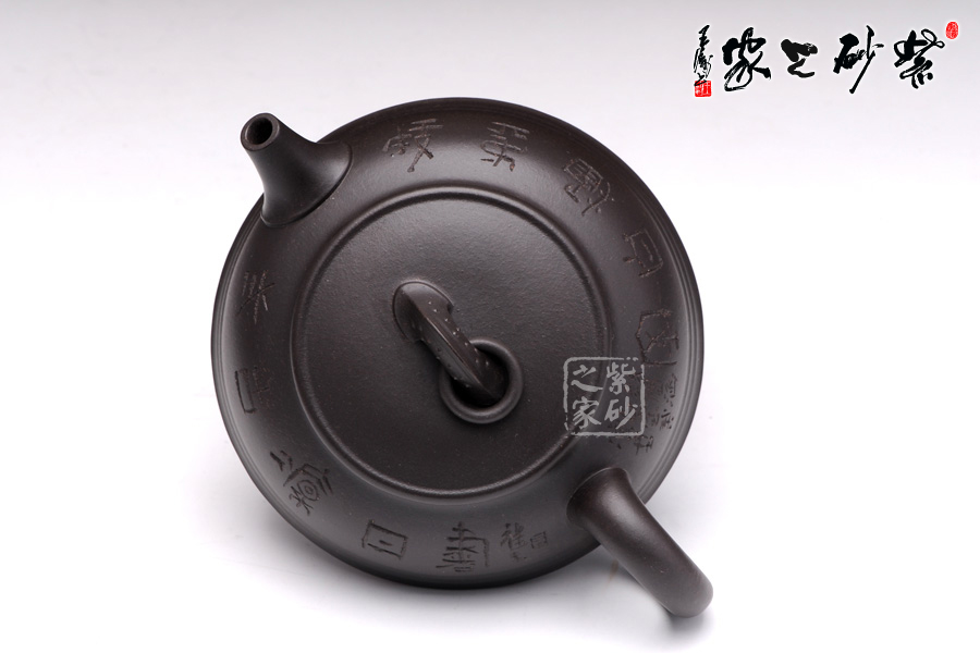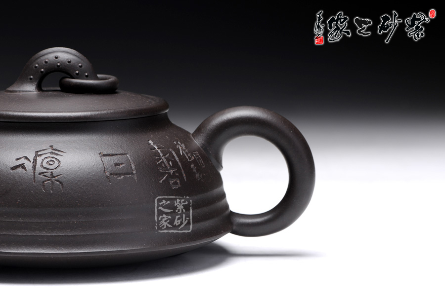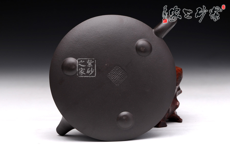 整体器形端庄而不失优雅,流线优美,壶身如倒扣的碗型,壶底边缘以玄纹环绕,动感十足,整体如同一气呵成;圆润端把,明接精湛,盈盈一握,端握称手;明接直流嘴,强势胥出,嘴口圆润,出水迅猛爽;平盖纤薄,光洁如镜,桥形钮饰为鱼龙之形,以一环扣之,玲珑精巧。