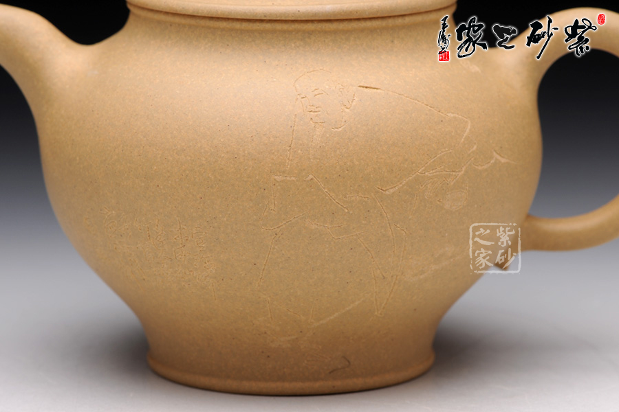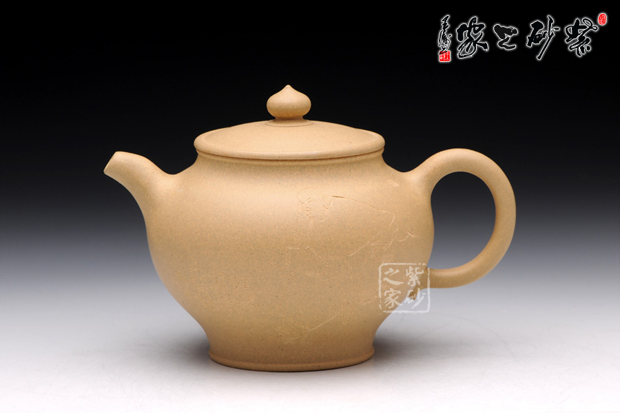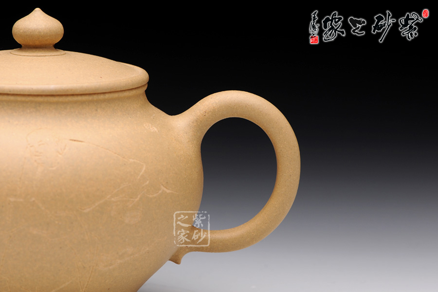 顶珠壶,因盖顶圆珠而得名,圆珠为钮,鼎立高耸,如佛光普照一般,寓意吉祥;此壶有着浑圆的壶身,半圆的壶盖,桃形钮顶端留尖,壶身线条流畅,比例得当,压盖轻柔,点线之间见出魅力,子母线口盖温和严密,骨肉亭匀,简练大方,制作颇 见功力;一弯流嘴胥出,在端头下压,柔美之姿明显,壶柄略微上抬之后优雅滑落而下,形成一条圆润饱满的弧线,朴雅大方;加底设计,且壶身下段渐渐内敛,有承托壶身之力,更显的大气磅礴。壶正面刻绘了一个神情泰然居士,壶背面刻绘的是“致远”二字,意蕴深远。