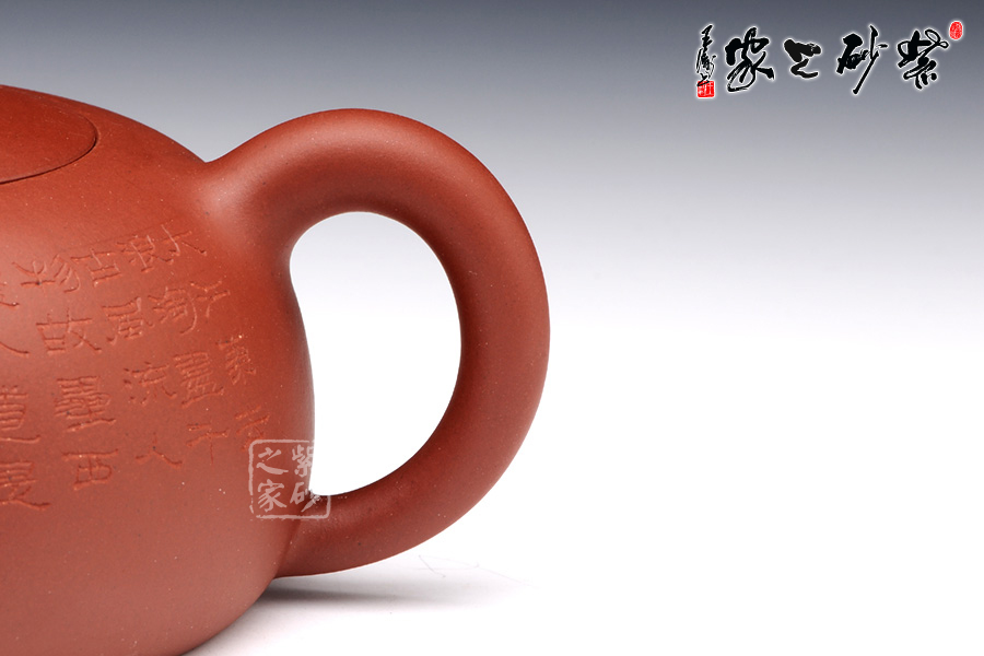 此壶由原矿朱泥制作而成,简单细致,手感温润。壶型圆润而丰腴,犹如亭亭玉立的少女,唯美妙曼。微微上扬的壶嘴,好似摇曳在风中的舞姿。壶把与壶嘴,相连一线,返璞归真。嵌盖。口盖平整光滑,与壶体融为一体。壶钮为一饱满水滴,娇俏而不羸弱。壶盖古朴典雅。壶身两侧刻绘“念奴娇·赤壁怀古”苍劲有力。刻者有着极深的功力,以刀代笔在胚体上信手刻来,潇洒飘逸。