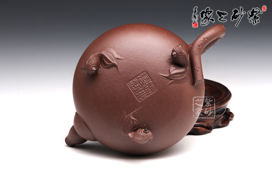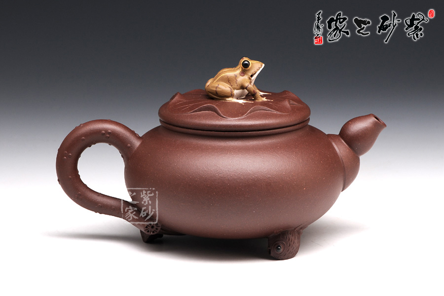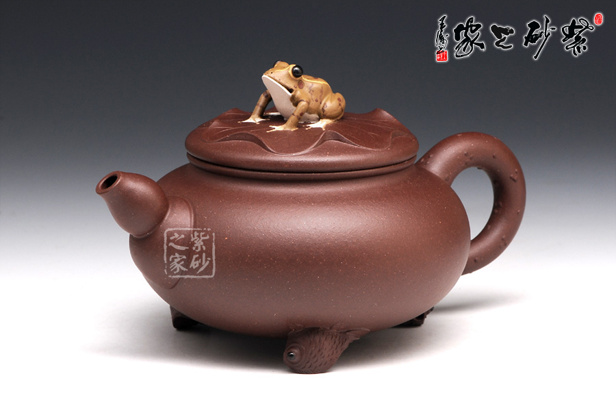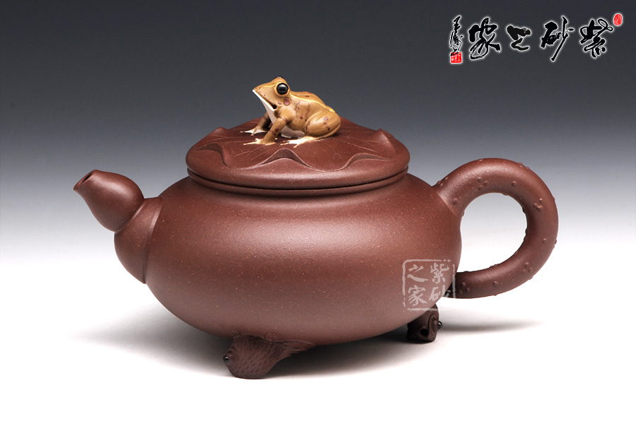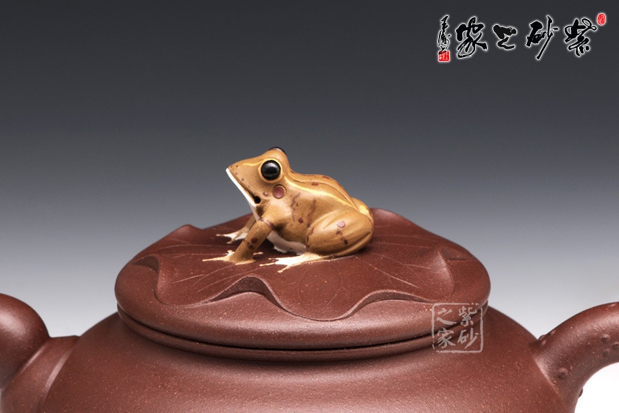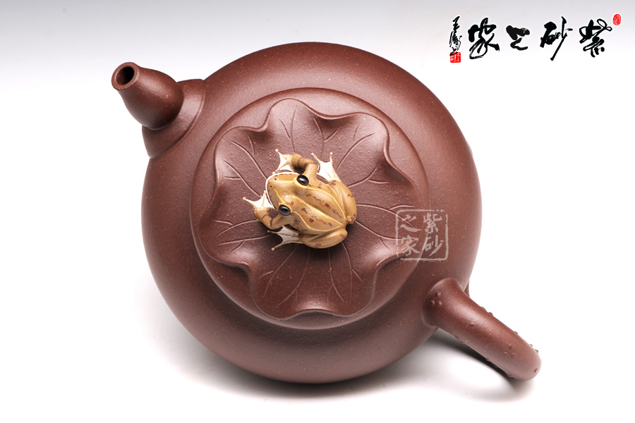 壶身是一个扁圆的球型,轮廓丰满诱人,可爱至极。压盖子母线工整对接,盖上平置一张荷叶,荷叶上一只青蛙安坐,色彩鲜明,造型逼真。壶嘴是莲藕造型,粗细变化均匀有致。壶把乃是荷叶茎,不光有斑点装饰,更有气孔展示。壶底部的三条小金鱼尤其动人,将此壶的趣味表现到极致。