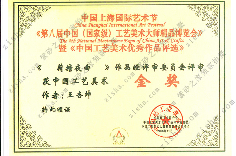 2006年11月作品《荷塘夜曲》获第八届中国国家级工艺美术大师精品展金奖