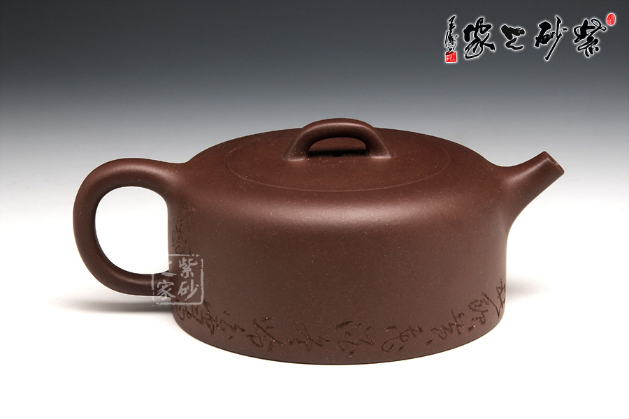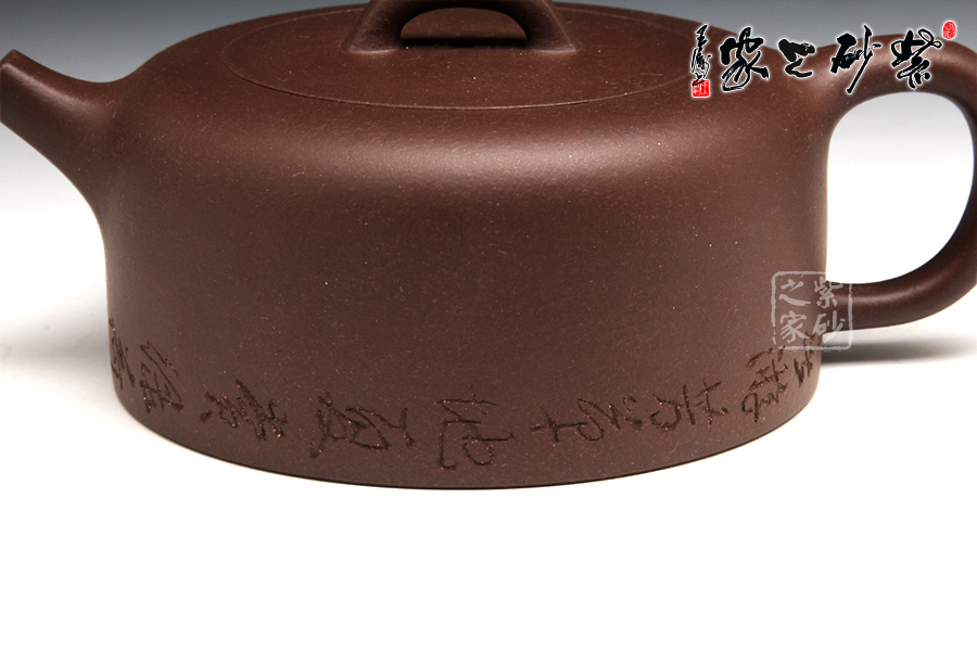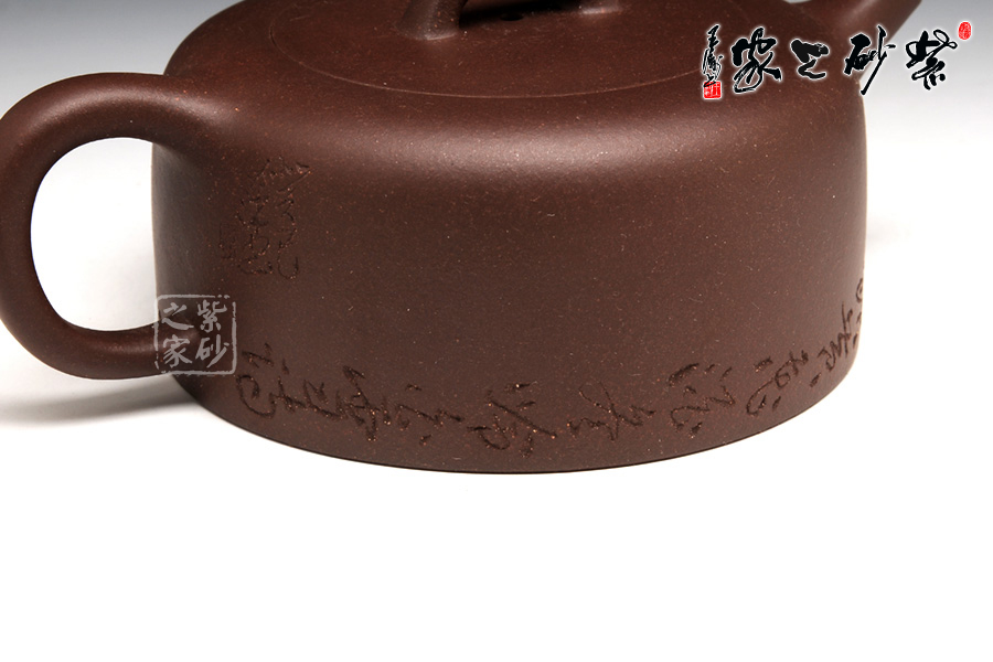 此壶线条圆融有力,简洁明快,沉稳而不凝滞,壶身呈桶状,柔和圆滑,四方圈把与细 小壶嘴对称相应,嵌盖设计严丝密缝,拱形壶钮经典再现,壶底老师别出新裁,将刻字围绕壶身一周,意境十足,作品以简练的线条构成淳朴凝重的形体,深厚且具神韵,设计上空间明快,虚实和谐,提携舒适,线条柔和,使整体造型更加雄浑肃穆。壶底边缘环刻“春游芳草地,夏赏绿荷池,秋饮黄花酒,冬吟白雪诗”,意境优美动人,情趣感人。