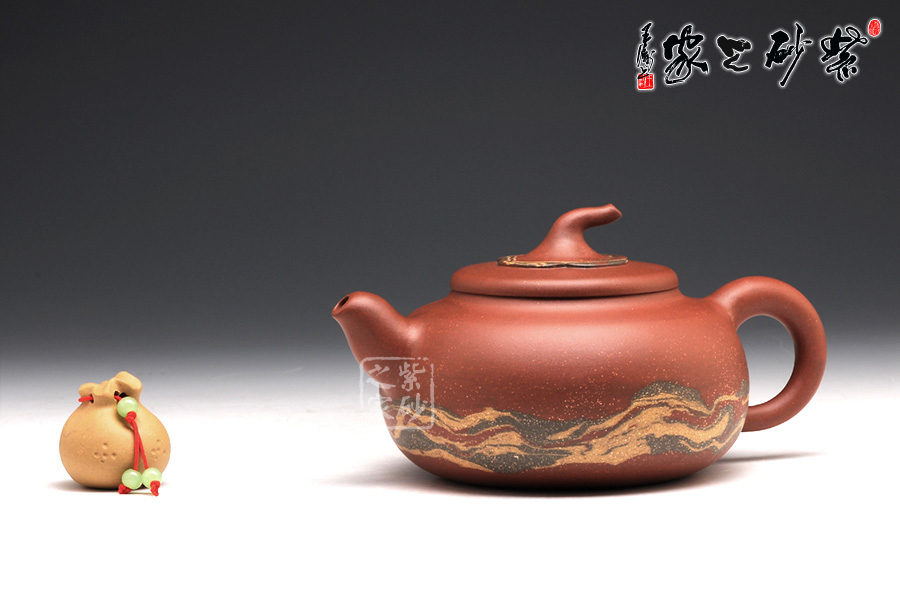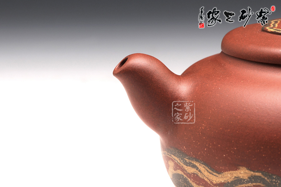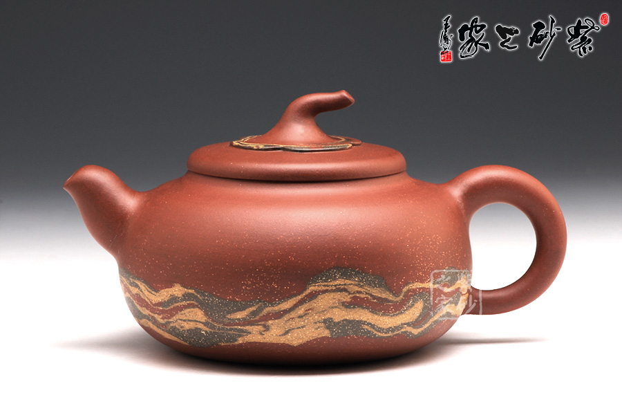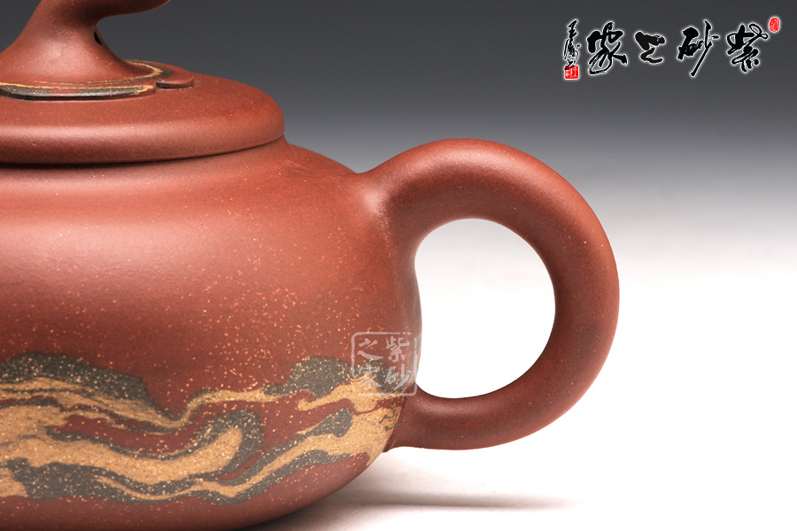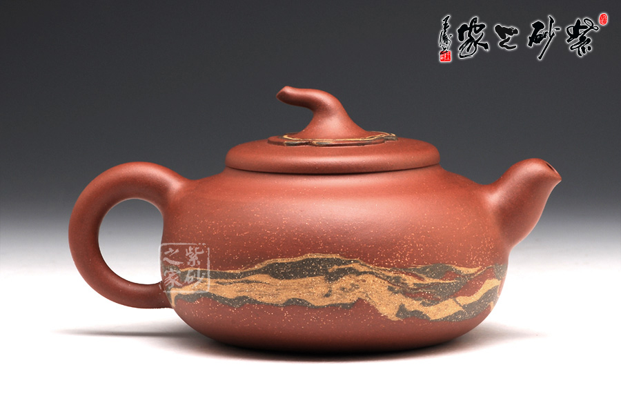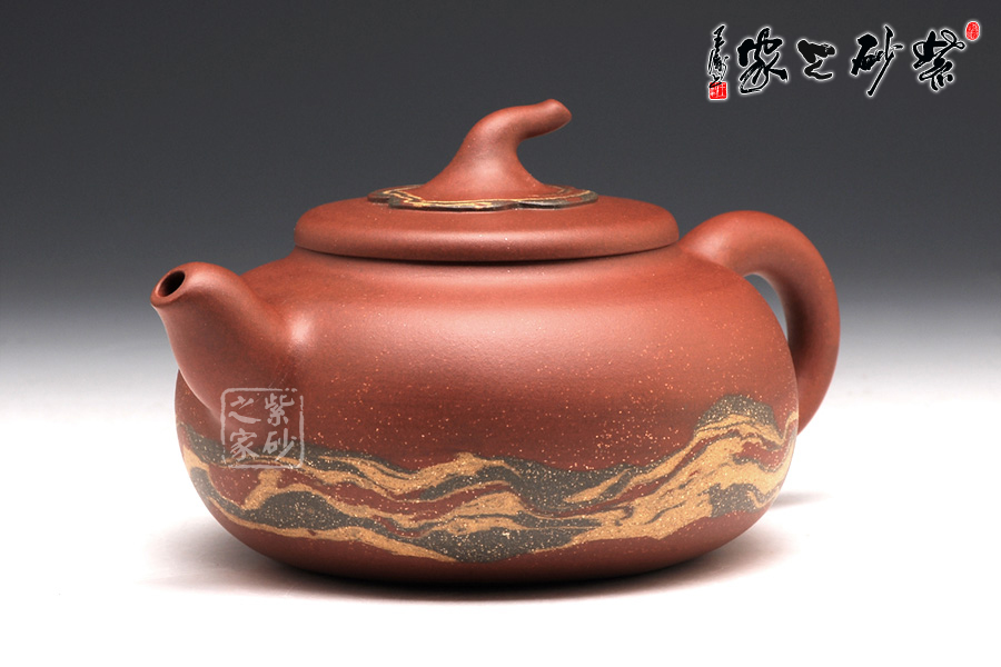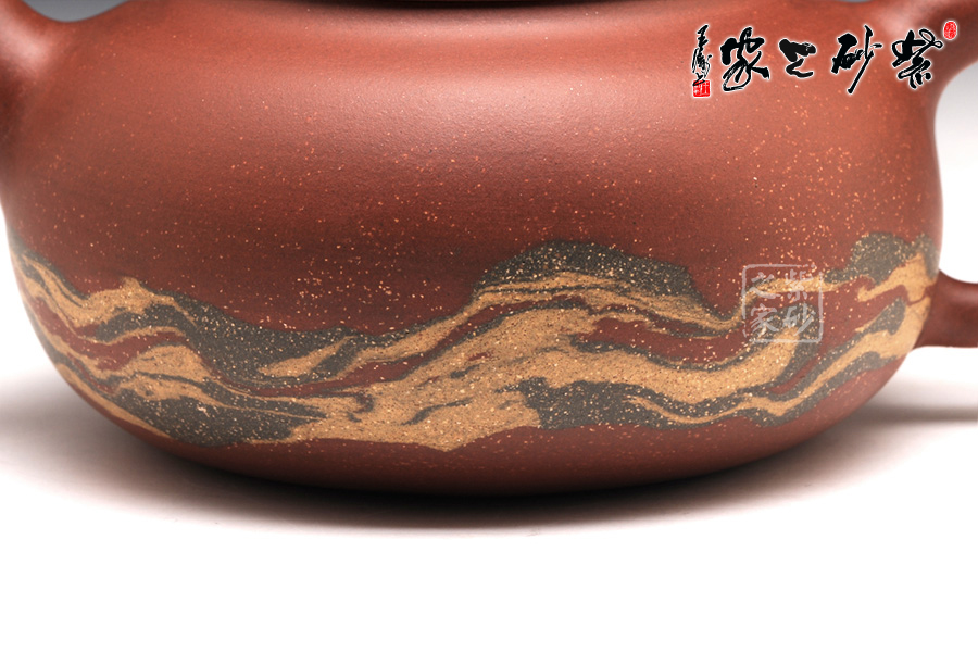 壶身的扁圆非常工整,上下两面平滑自然,轮廓丰盈诱人。压盖设计,盖沿平整光滑,盖上一马平川。茄蒂壶钮仿于自然,却更加精炼动人。弯流壶嘴短促有力,线条凝重,圈型把小巧可爱,粗重结实。绞泥装饰的壶身,似碧波荡漾,又像是天际云霞。