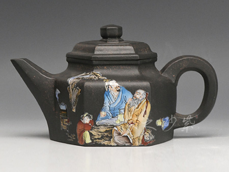 此壶正面由二级工艺美术师-开四海铭刻:听禅。反面铭刻:山水画。