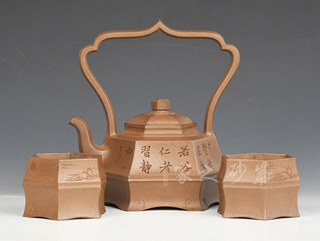壶身被分为六面,切面平滑,棱角分明。肩部用斜角过渡,压盖对接严密,柱形钮小巧简洁。壶嘴和把虽然是弧形,但外观用切面装饰,于圆润里透着工整和老味,意味独特。