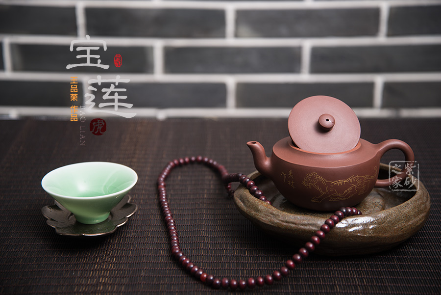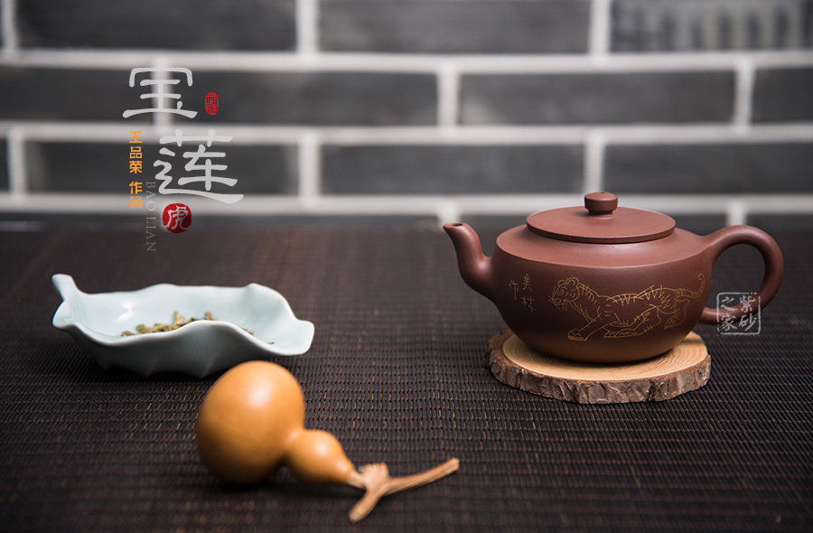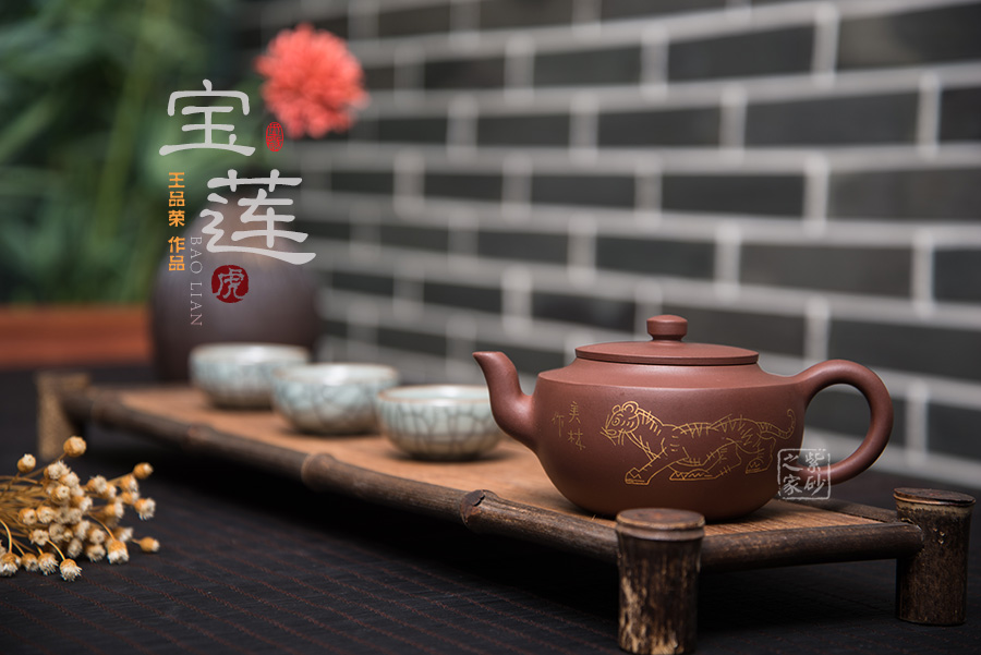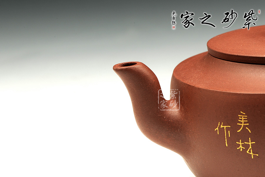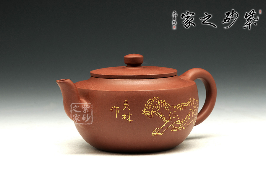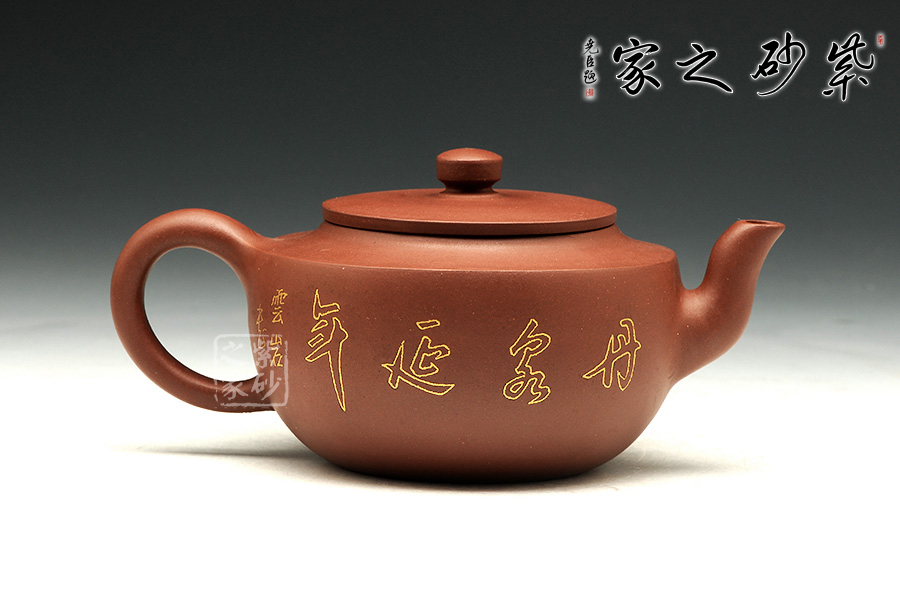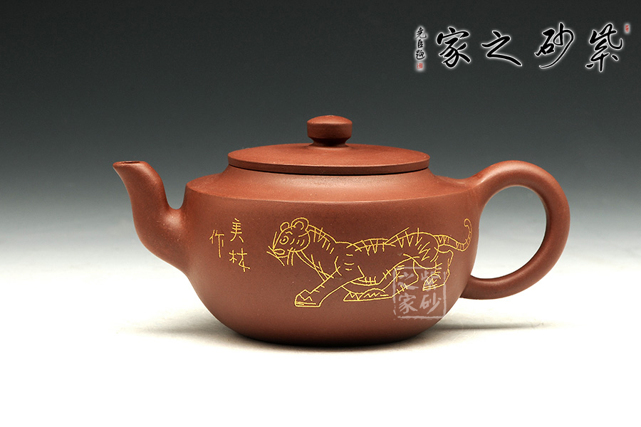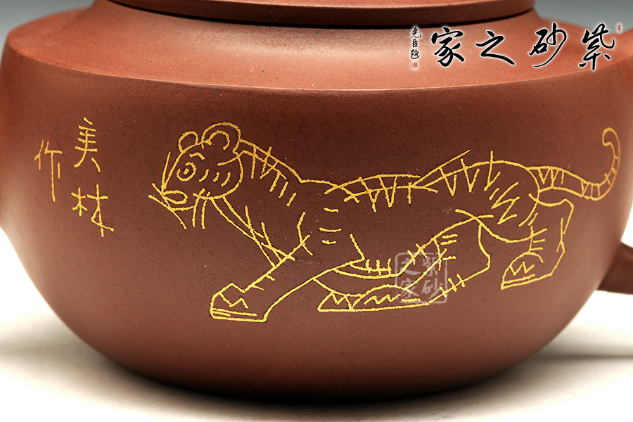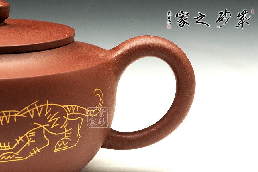 此壶壶体饱满,形制稳健,加之刻绘描金装饰别有一番清趣。壶身略扁而饱满,三弯流,平盖协调而雅致,典雅的壶身将紫砂壶典雅古朴的气质巧妙体现。同时,此壶特别适宜于品茗,壶体虽然不大却似一副颇能吐纳之姿。由于做工精细,实用价值高,冲泡出茶汤温和 醇香,韵味悠长。