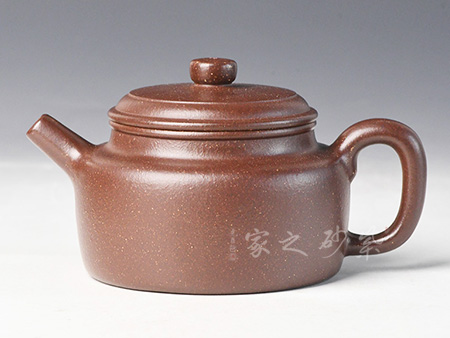 紫金砂是用30年前的黄龙山原矿老紫泥和朱砂按一定比例自己特别调配的,这种泥料现剩量不多,所制的壶透气性高,吸水性强,很容易包桨,是原矿紫砂料中不可多得的料