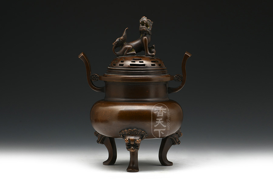 形取青铜三足鼎式,炉形敦厚规整,炉盖雕刻八卦图案,八卦可以改善风水、镇宅、化解冲射、挡煞避邪,具有挡煞化煞的作用,可以将煞气四方挡散,达到把煞气瓦解之功效,按照中华易经及风水学说的理论,它还具有旺财化煞、祛病除邪、趋吉避凶、调节人体气运的功能。炉钮饰狮子戏球,活泼可爱,寓意吉祥。炉口平整,束颈鼓腹,肩起双朝冠耳,双耳挺拔,鼓腹下垂,雍容华贵,下承三足,作狮首状,狮子威武霸气,是辟邪镇宅的吉祥物。香炉铜质精良,手感厚重,是陈设案头的佳物。