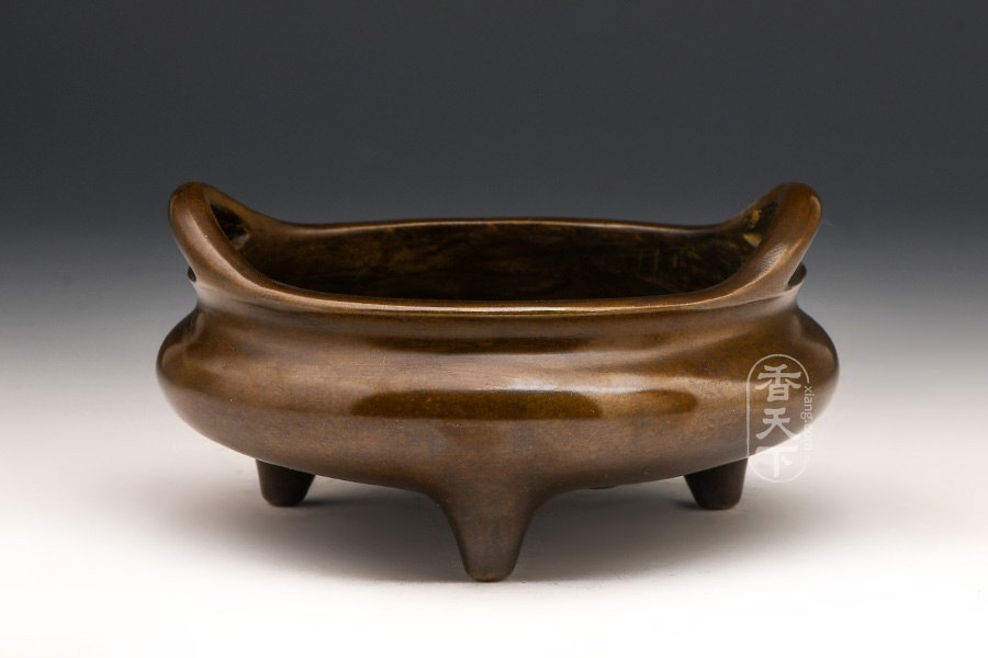 宣炉以简为美,此款桥耳器形简洁,线条流畅,老壳色泽诱人手感沉稳光滑。典型明式风格,精光内敛,珠光外现,扁腹圆口。三乳足,线条明快。