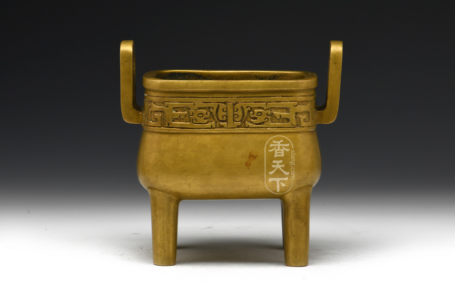 整器造型规整大方,稳重雅致,线条柔和而不失坚挺。方鼎器形仿古,稳重庄严,器形之至刚与纹饰之柔逸完美统一。朝冠耳又称官帽耳,取官帽之形而来,双耳线条优美流畅,刚柔并济。器身精工细铸,通体无纹,既有皇家的威严,又有吉庆的寓意,可谓“淳朴率真,天然谢雕饰”之风格,雪花金装饰,使得整器更具皇家气势,日久用之,必光润有度,手感细腻,堪为炉之佳器。