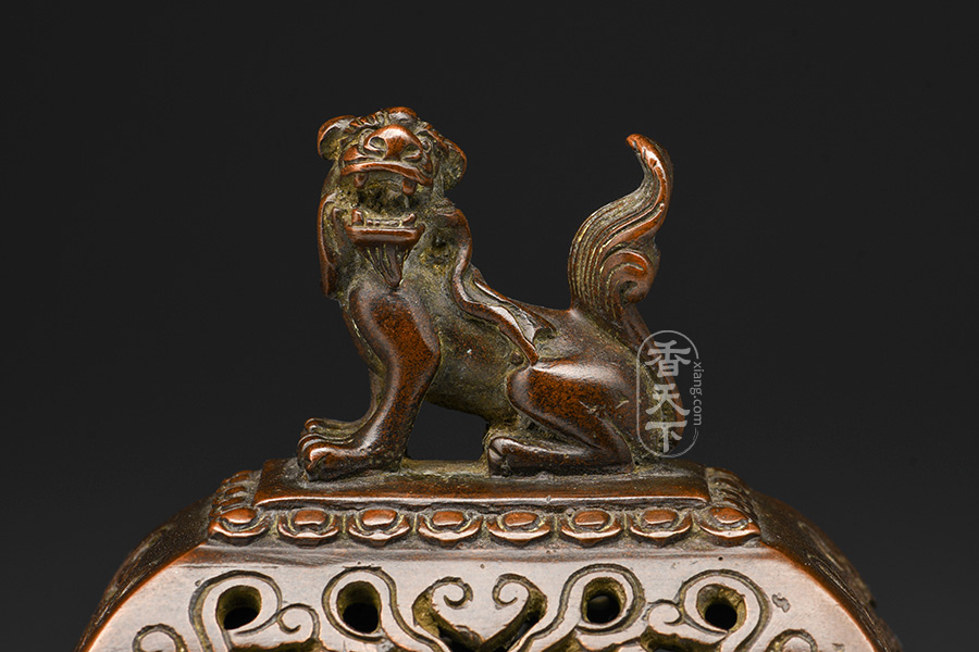 陈巧生制狮钮台几炉带座款。台几炉语出《宣德彝器图谱》卷十五,原器仿自唐代天宝局制台几炉,为唐代几案形状,故名台几炉,为宣德炉中正方炉之经典器形。台几炉除宫廷内府使用外,宣德帝将之赏赐詹事府。炉盖上铸狮子绣球钮,狮子滚绣球寓意着驱邪、消灾、喜庆,所谓是“狮子滚绣球,好事在后头”。
