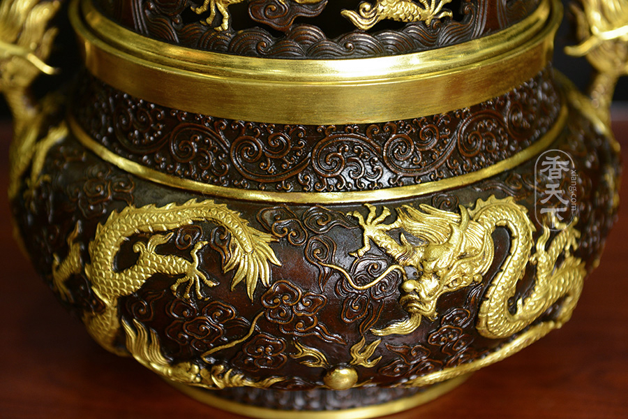 “鎏金海水云龙香熏炉”在铜胎上鎏金、雕镂,因此外观上看来流光焕彩,精工巧丽,贵气繁生。整体看,作品像一顶完整的加冕王冠,雕龙缀云,精光朗丽。细看每一处的设计,炉盖顶部雕镂着一尾龙,衔珠盘踞,四肢强壮有力,穿梭于海水祥云之中。炉盖下部雕以数条龙纹,游动貌与炉盖互相衬托、相得益彰。祥龙与海云,浑然一体,龙即为云,云即为龙。