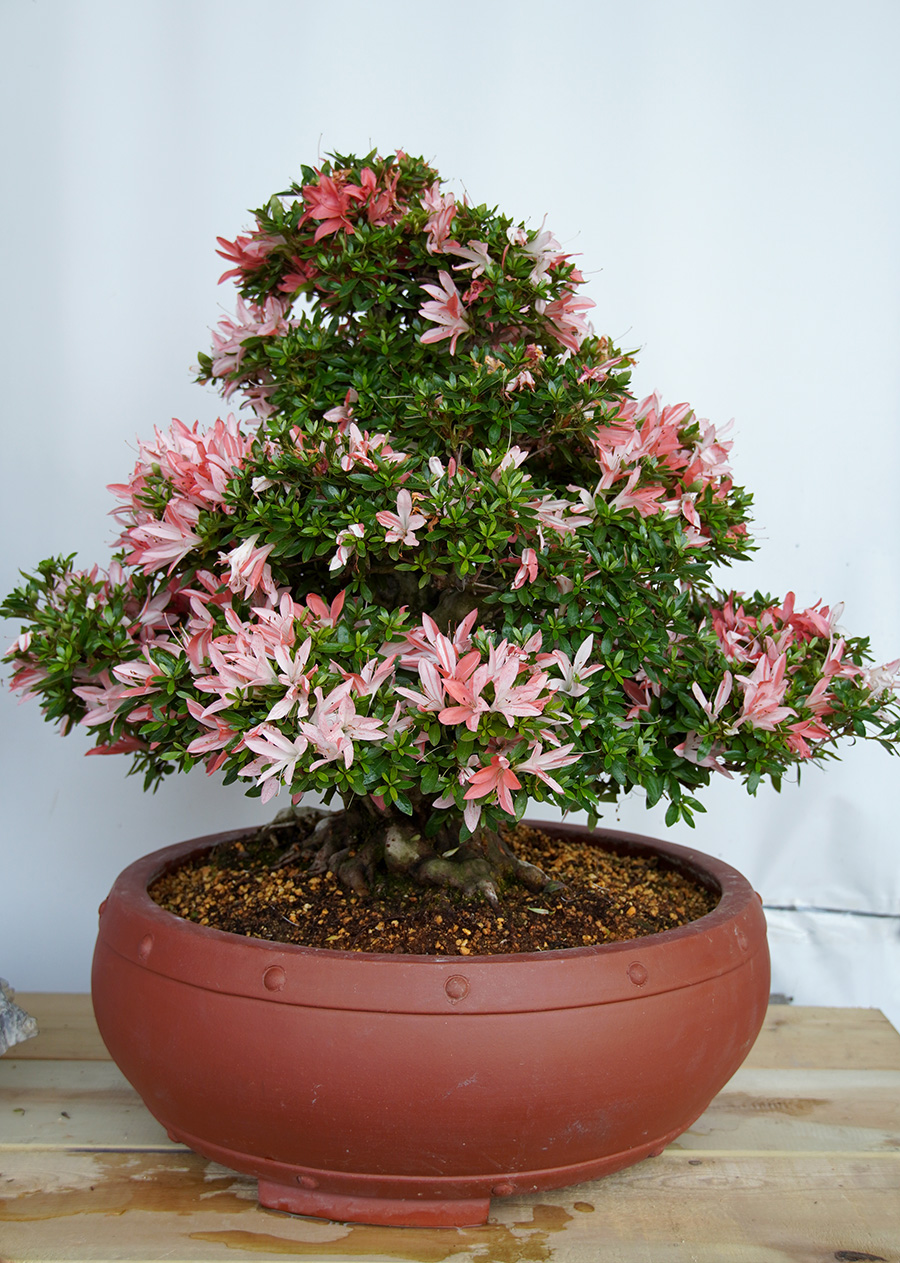 日本皋月系杜鹃 这棵树是超级土豪矮霸型,枝干老道,过渡非常自然,根盘粗壮,整体树型厚重大气,层次分明,花色艳丽迷人,是难得好货!