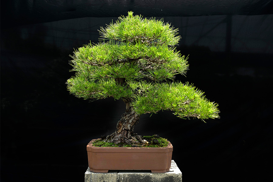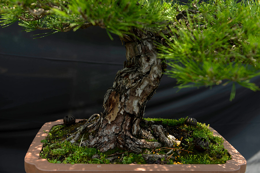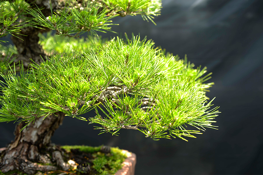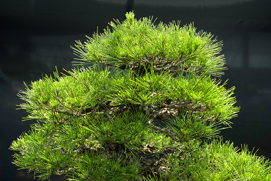 树干老辣,枝干比例协调,均作斜势,姿形幽雅得体,枝片成簇生,枝繁叶茂、团峦厚重;熟碣色的杆身、墨绿浓重的叶色,苍老朴实,刚劲坚毅,庄重肃穆。