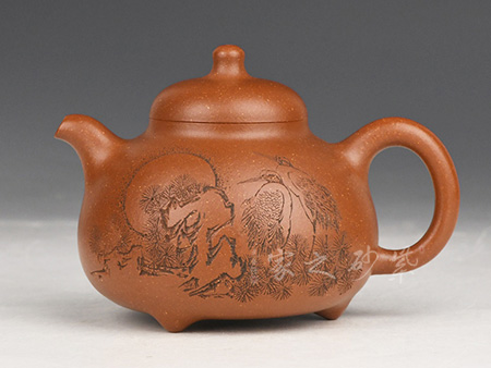 宝鼎形象,雅韵十足。压盖设计,完美贴合,气密性良好,壶钮扁状,精致小巧。壶嘴和耳把细腻自然,俊美有力。壶底四小足,则分外可人,衬托整器。