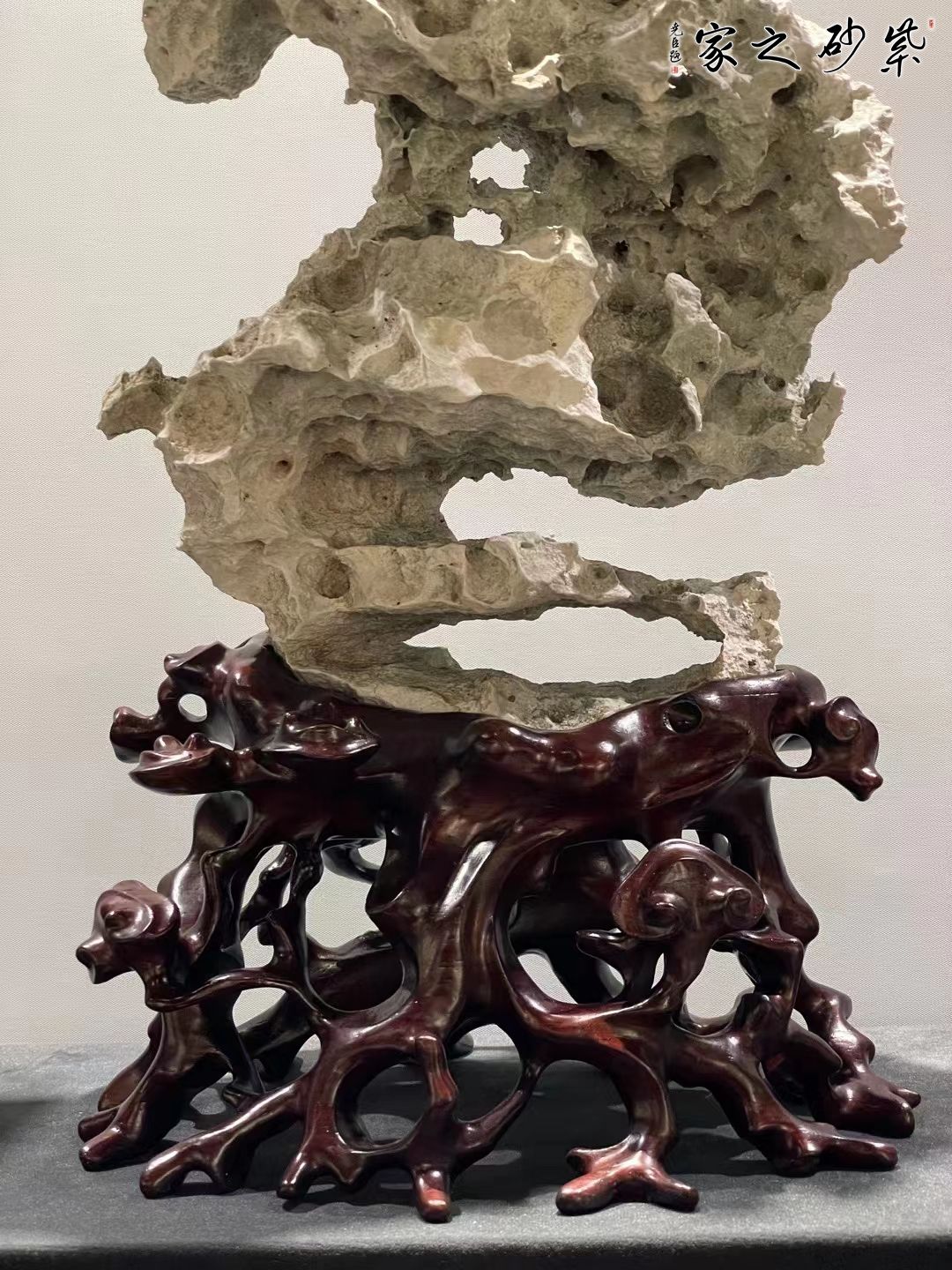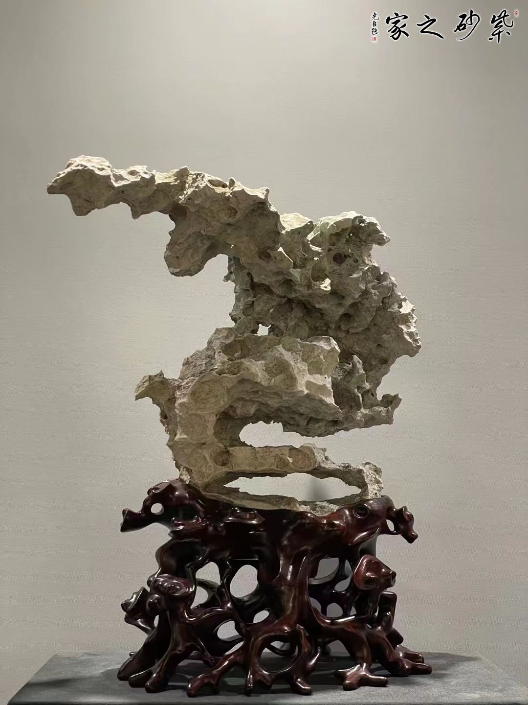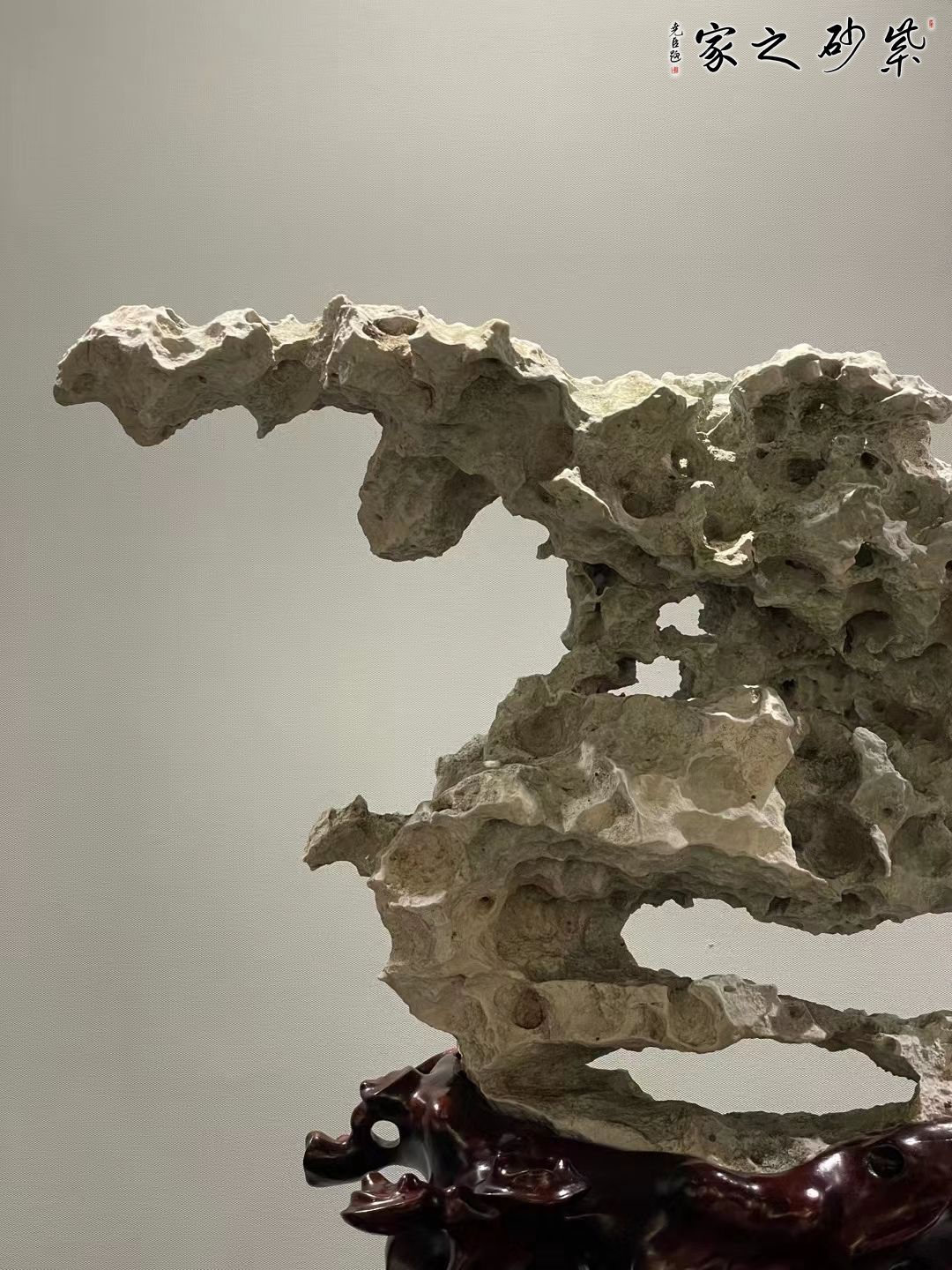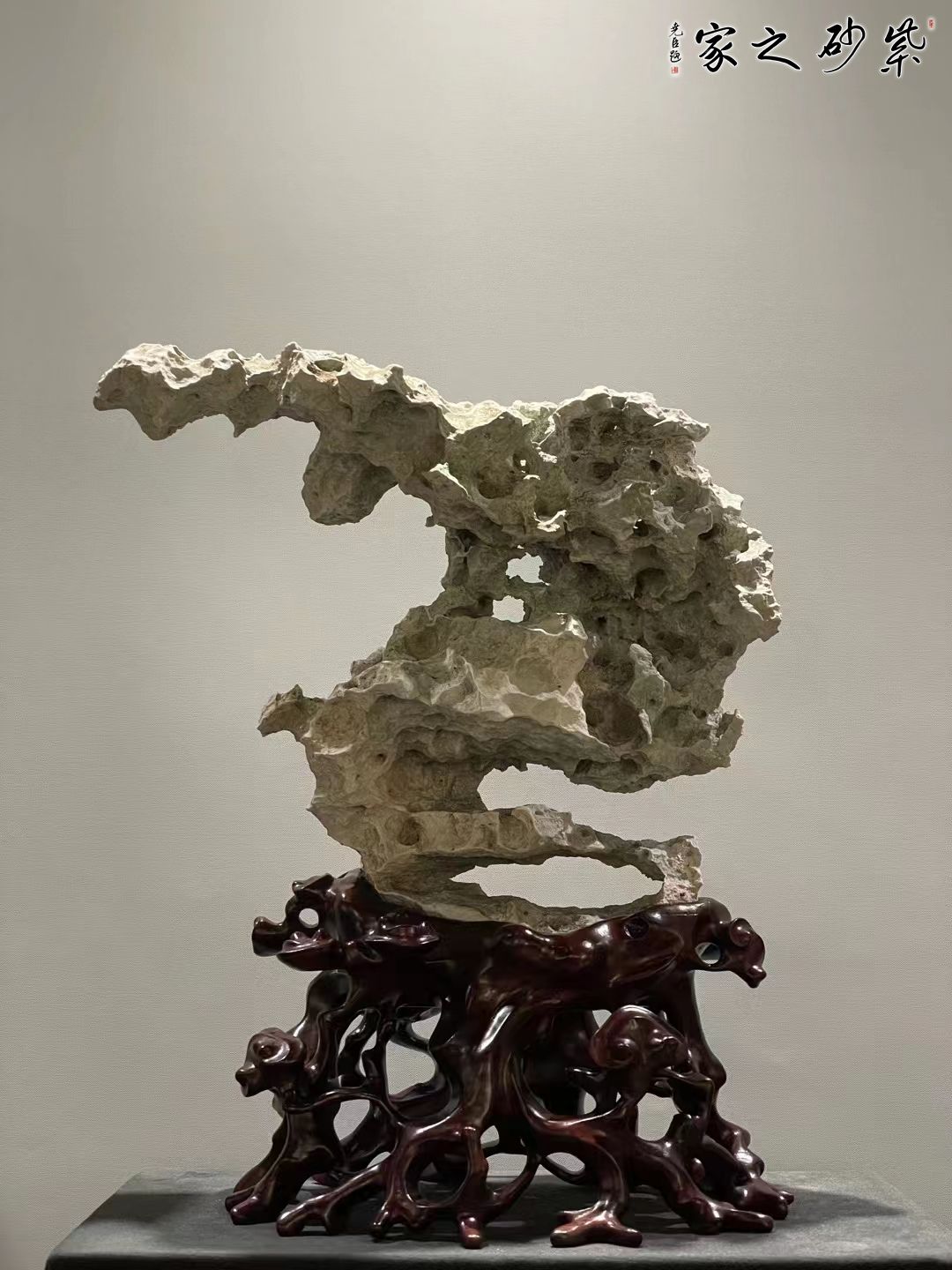 此石灵动飘逸,气酣跋烛,险峰峭影,两头飞簷,音声如磬。匪雨露而常泽,起卧兮欲立。置之斋中,足堪奇品!