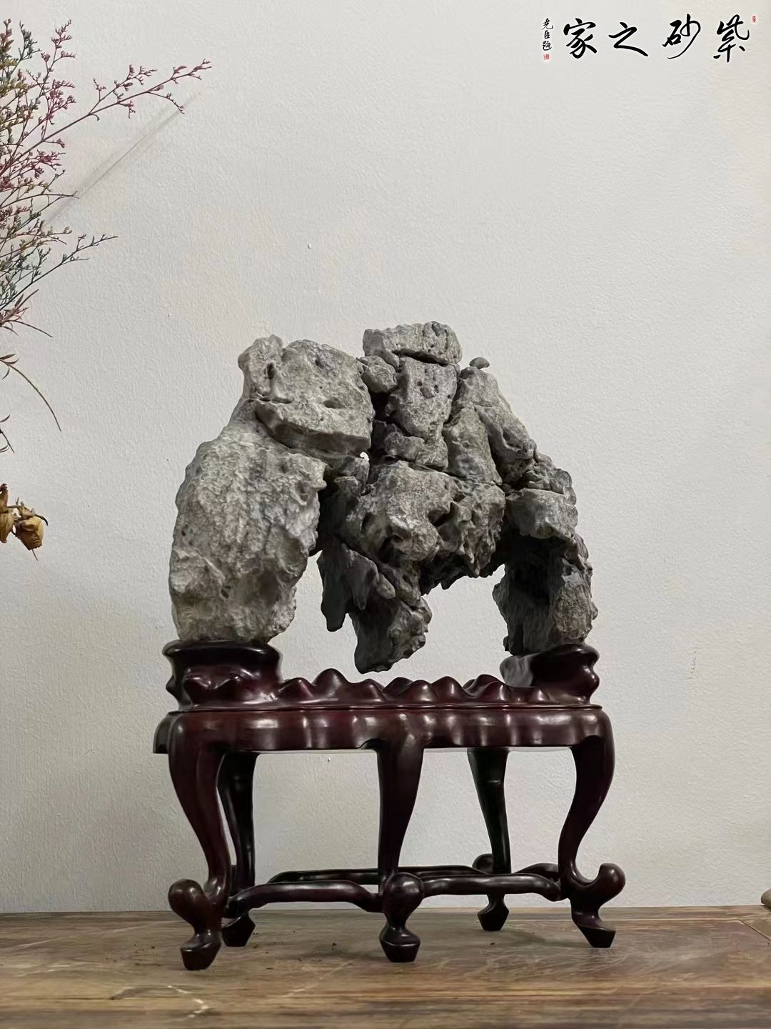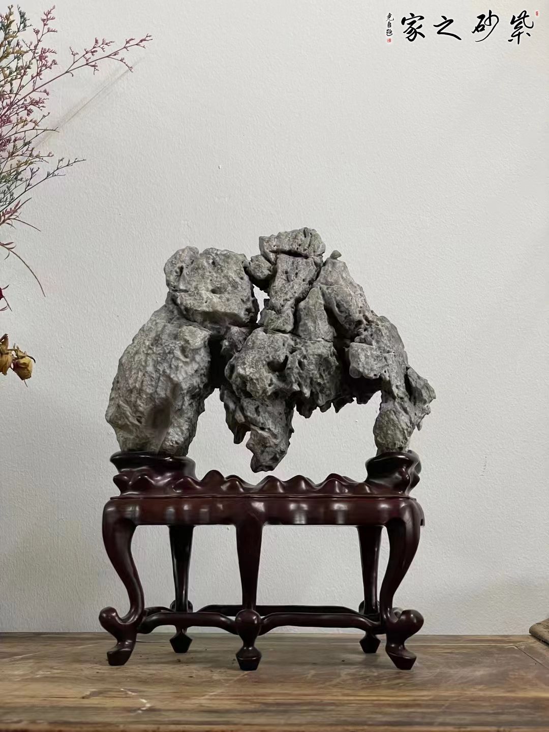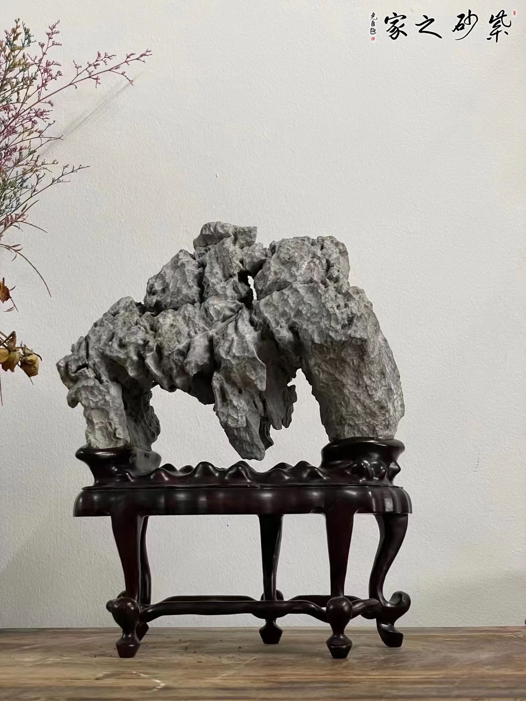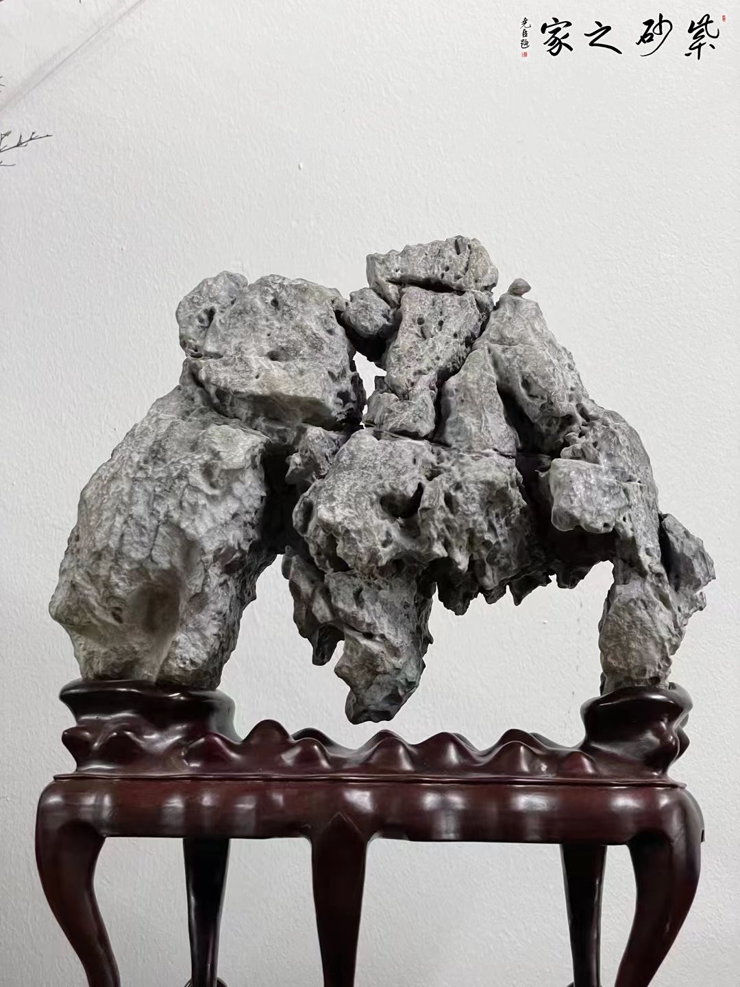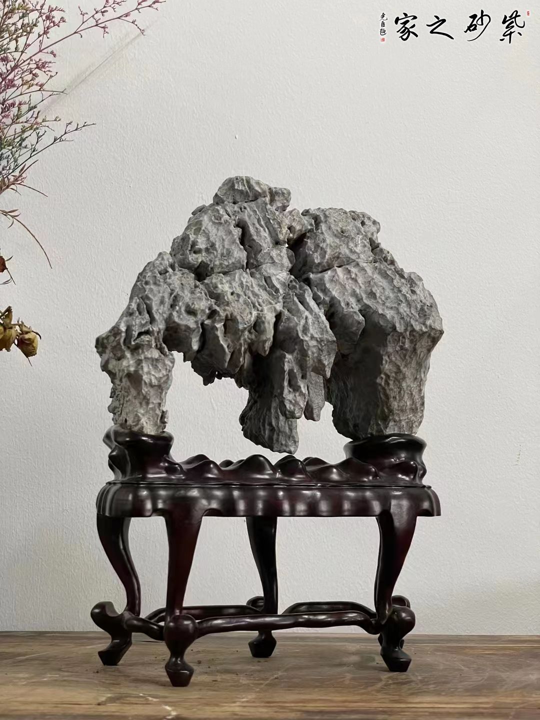 英德石原石,上势俊美挺拔,起伏连绵,皱态有致,坡壑明显,清润灵动,得天划神镂之巧,配苏工高脚底座,韵味十足