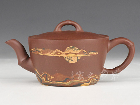 壶身圆润饱满,线条流畅。三弯嘴出水爽利,耳把拿捏舒适。截盖设计,严丝合缝,滴钮小巧可爱。刻绘山水图,山水交接,高山巍峨层峦叠嶂,间或有草木丛生其中,画面立体生动,意境高古。
