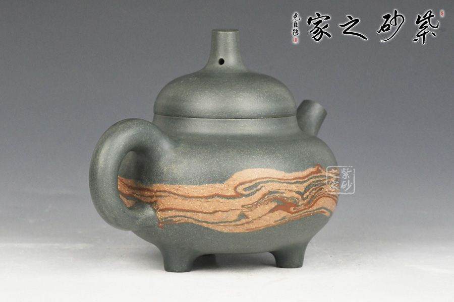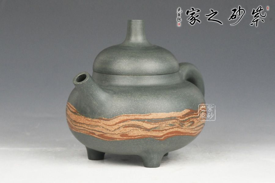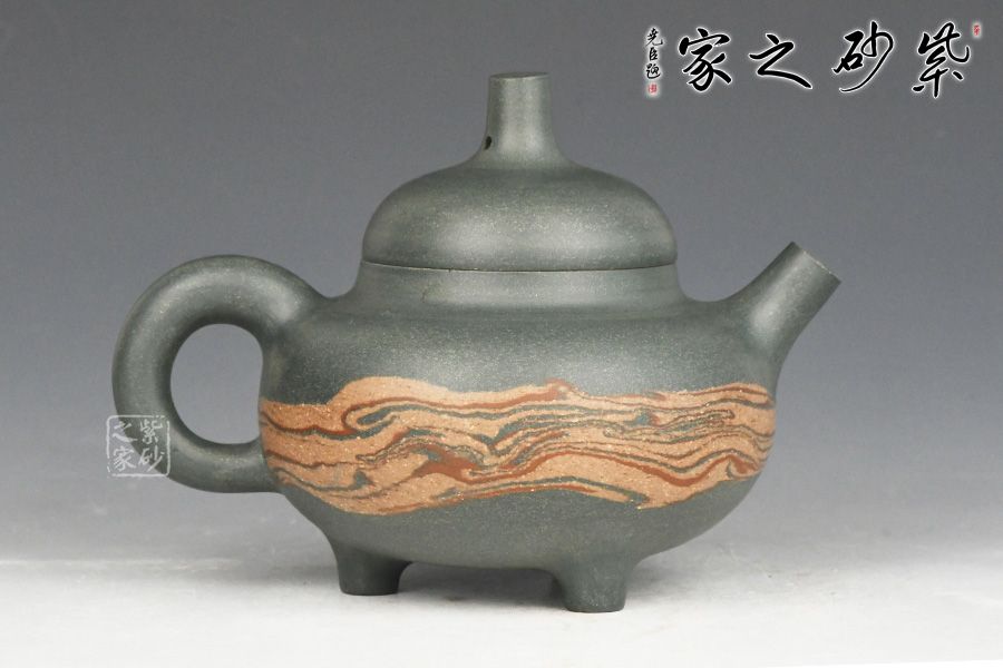 简介:绿泥,玩者暱称“绿豆砂泥”,古云“豆碧色”,泥色酷似绿豆皮,澹草绿。带本山绿泥细黄砂,清丽出众、雅俗共赏。所制壶品质感朴拙,砂质细腻而富有颗粒美感。壶品色泽米黄泛青,泡养后逐步转为温润的亮色,包浆感好而易于泡养,发幽然青光。产于黄龙山矿脉,是紫砂泥中的夹脂,故有“泥中泥”之称。产量不多,泥质较嫩,耐火力也比紫泥为低。原矿色泽为青灰泛绿,成片岩状或粉末状,以手拿之即会沾染上原矿粉末颜色。也常作为胎身外面的粉料或涂料,使紫砂陶器皿的颜色更为多彩。