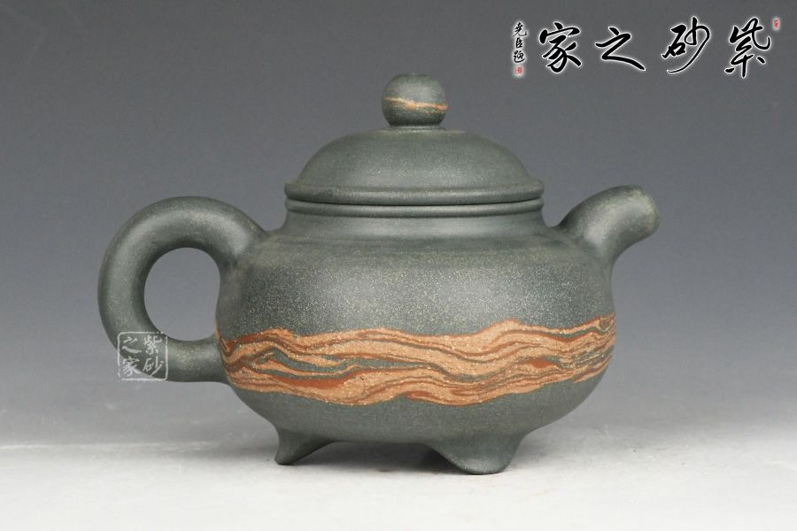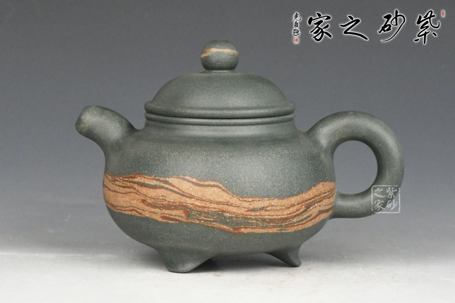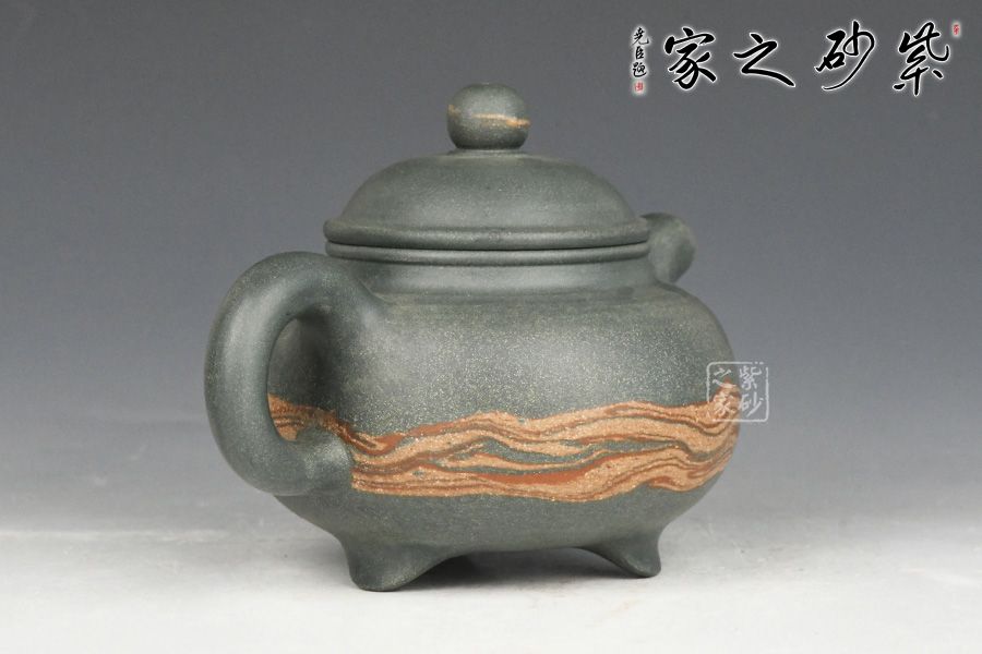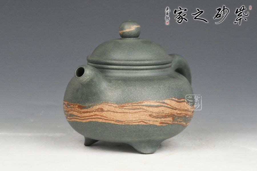 简介:绿泥,玩者暱称“绿豆砂泥”,古云“豆碧色”,泥色酷似绿豆皮,澹草绿。带本山绿泥细黄砂,清丽出众、雅俗共赏。所制壶品质感朴拙,砂质细腻而富有颗粒美感。壶品色泽米黄泛青,泡养后逐步转为温润的亮色,包浆感好而易于泡养,发幽然青光。产于黄龙山矿脉,是紫砂泥中的夹脂,故有“泥中泥”之称。产量不多,泥质较嫩,耐火力也比紫泥为低。原矿色泽为青灰泛绿,成片岩状或粉末状,以手拿之即会沾染上原矿粉末颜色。也常作为胎身外面的粉料或涂料,使紫砂陶器皿的颜色更为多彩。
