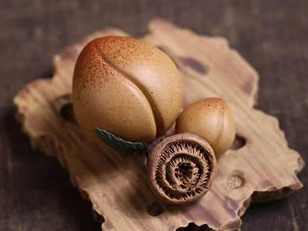 泥性:感甜嫩绵密,质坚而温润,呈近田黄色调,为江苏宜兴赵庄山系朱泥矿~黄石黄之共生矿,经挑拣练製而成,因含铁量只达6%左右,致陶之后呈“金田黄色”。