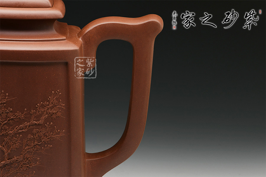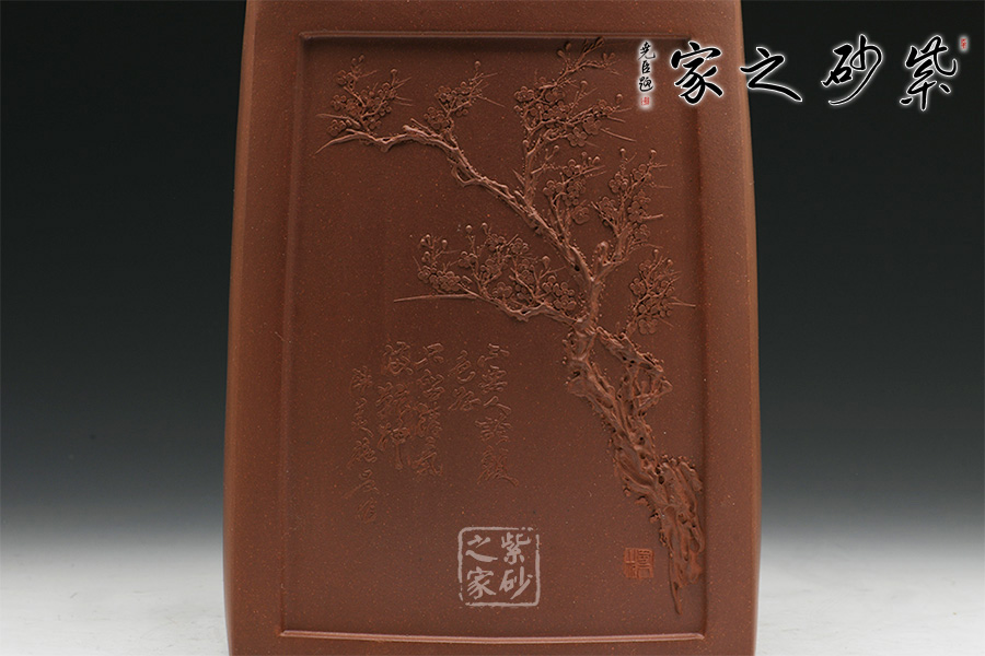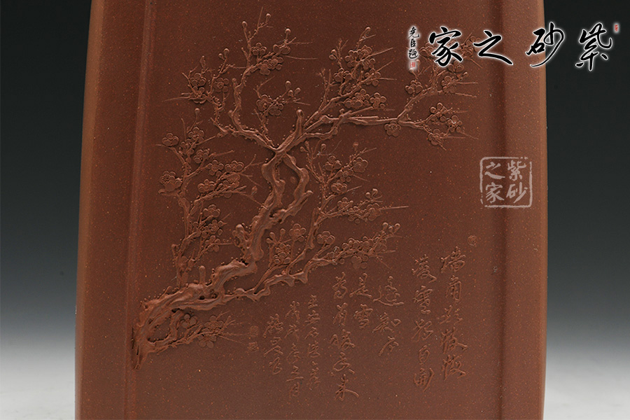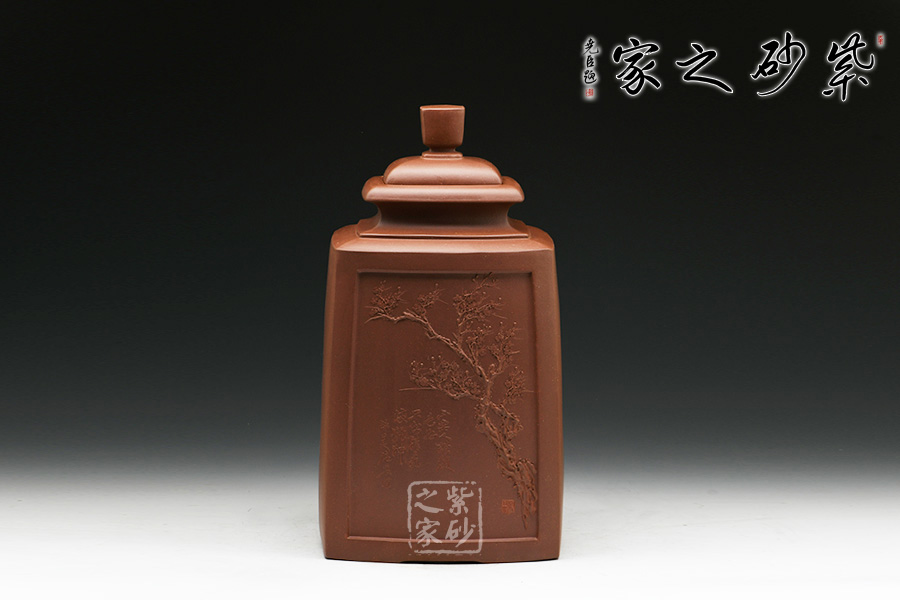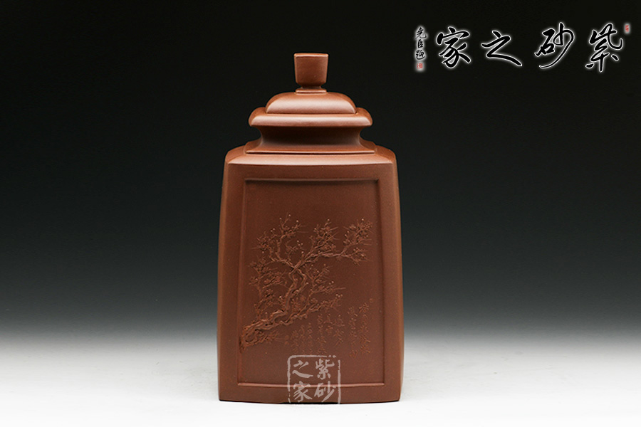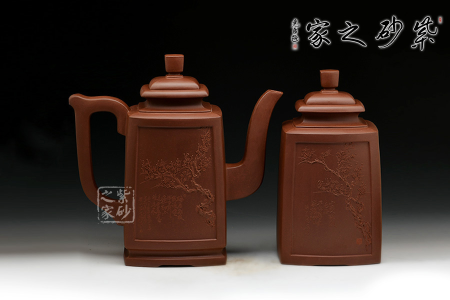 此款组合,为全手工方器,一摆件,一茶罐,整体无论是点、线、面皆挺括,线条明朗利落,棱角分明。四方平盖,方砖壶钮,磊落大气。方形壶身,方钮、方把、方嘴,和谐有力。壶身虽以方位基础,却不呆板凝滞,刻绘梅花,朵朵梅花或盛开怒放、或含苞待放、或初绽花蕾,做工精致,写意悠远。整体上丰下敛,过渡渐变,气韵端庄不俗。