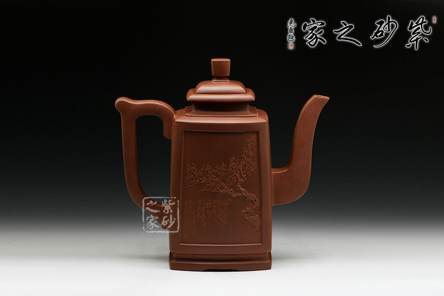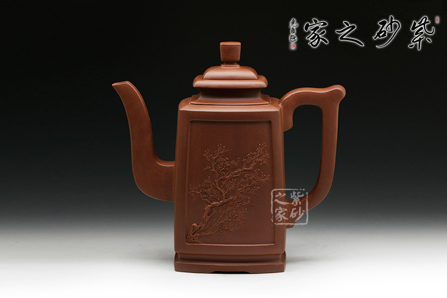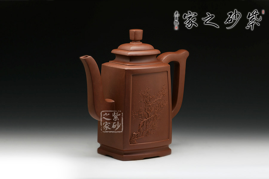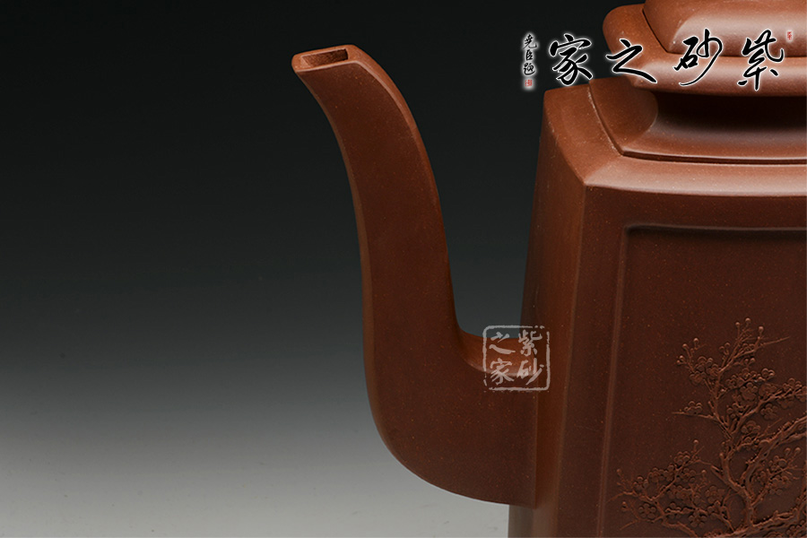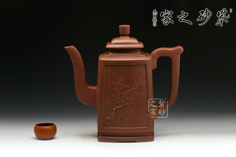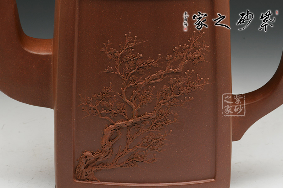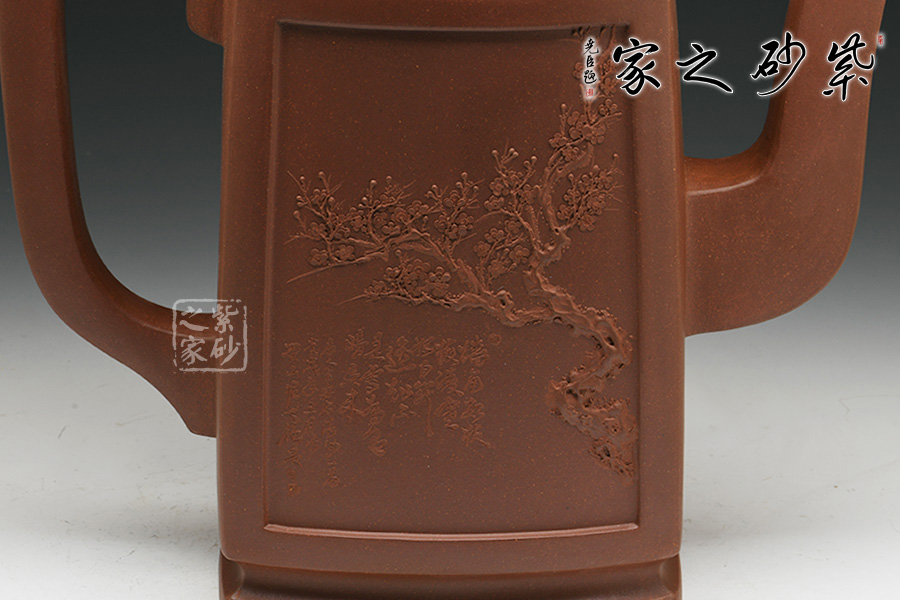 此款组合,为全手工方器,一摆件,一茶罐,整体无论是点、线、面皆挺括,线条明朗利落,棱角分明。四方平盖,方砖壶钮,磊落大气。方形壶身,方钮、方把、方嘴,和谐有力。壶身虽以方位基础,却不呆板凝滞,刻绘梅花,朵朵梅花或盛开怒放、或含苞待放、或初绽花蕾,做工精致,写意悠远。整体上丰下敛,过渡渐变,气韵端庄不俗。