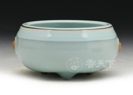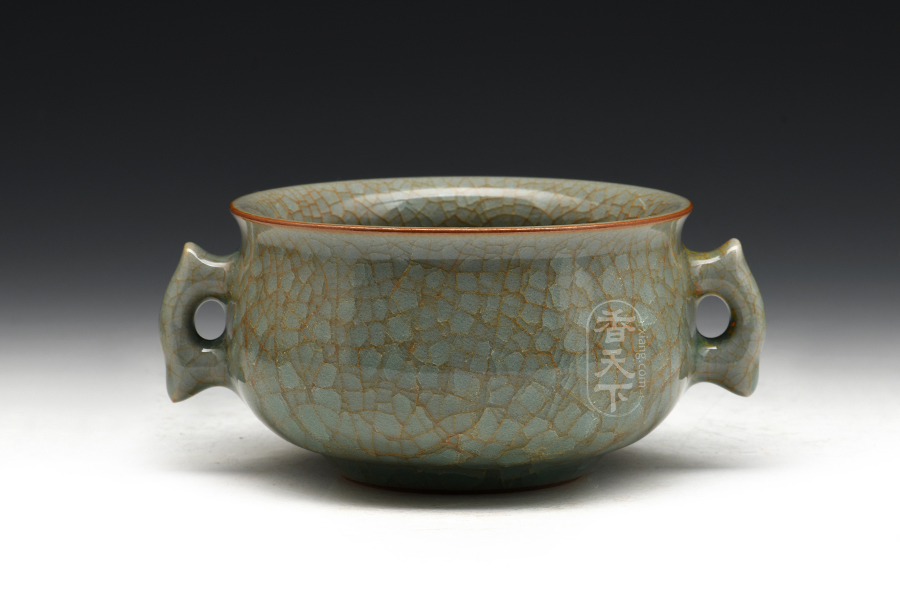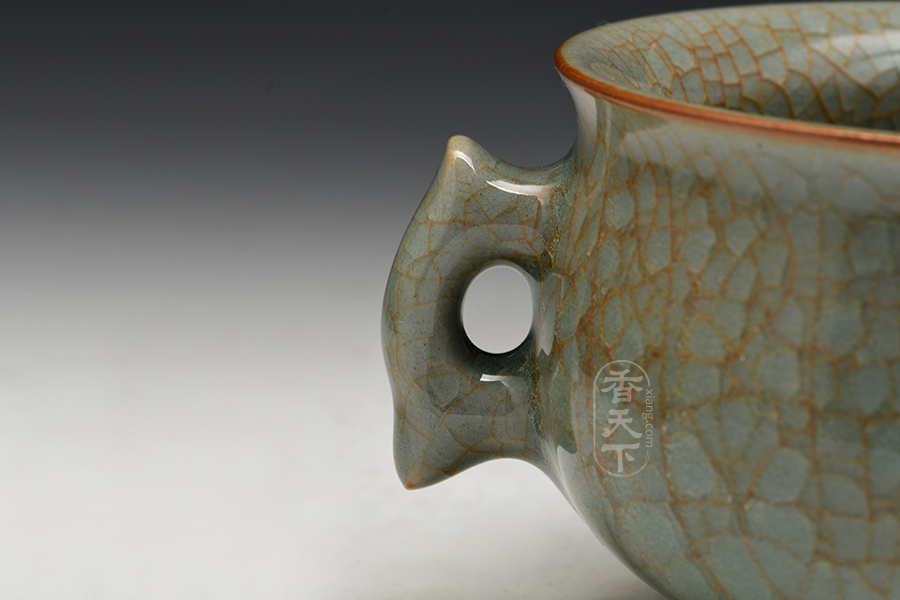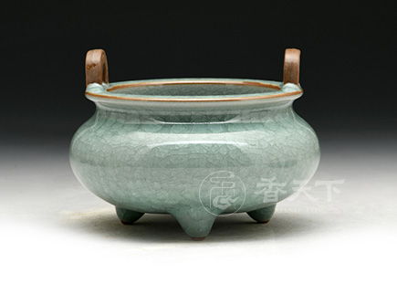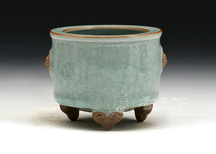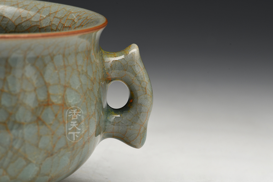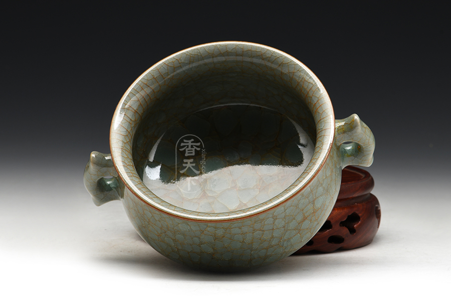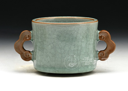 簋(音“轨”),流行于商代至春秋战国时期,是用来盛装煮熟食物的器皿。簋的形制多为圆形,广口,深腹,圈足,两耳或无耳,有的器耳做成兽面状。簋在商周时期还是重要的礼器。在祭祀和宴维时,它和鼎配套使用,有一套完整的制度。使用鼎和簋是贵族的特权,是身份和地位的象征。此款簋式炉冰裂纹为金丝,纹路清晰,香炉线条圆滑流畅,造型典雅端正,梅子青釉色清润,双耳饱满精神,瓷质细腻,堪称上品好炉。