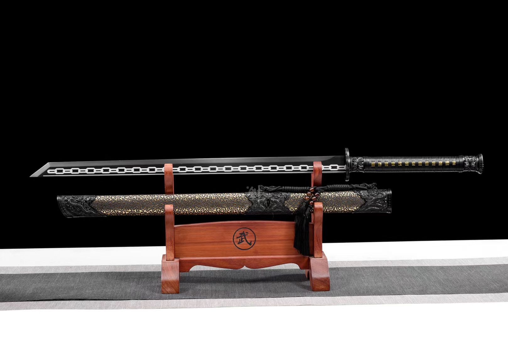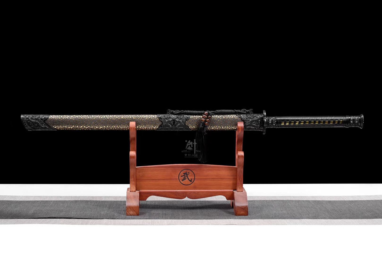 作者:武道 产地:龙泉 规格:长款刀 主题: 刃材:锰钢 风格:唐刀 尺寸:115*4*0.5cm 重量:2000g