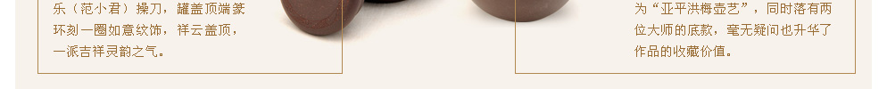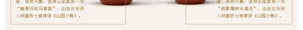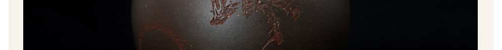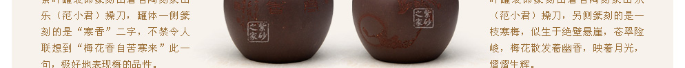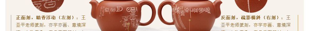 贺洪梅老师结合梅花的清香、疏瘦、淡泊等品性,将其化作壶艺的表现手法,并结合王亚平老师“亦字亦画”的飘逸书法篆刻和范小君(缶乐)的细腻雅致的篆刻技艺,创作了这款以梅花为主题的作品《暗香》,实为一款不俗的紫砂作品。