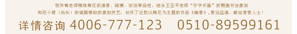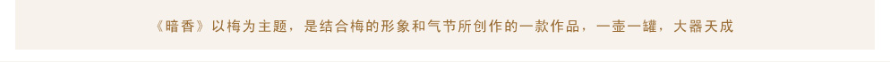 《暗香》以梅为主题,是结合梅的形象和气节所创作的一款作品;梅花是岁寒三友之一,花中四君子之首,自古以来,人们都赞美它的傲雪精神,它的孤傲和不语百花争春。梅花是中华民族的精神象征,具有强大而普遍的感染力和推动力,梅花象征坚韧不拔,百折不挠,奋勇当先,自强不息的精神品质。民间传说别的花都是春天才开,它却不一样,愈是寒冷,愈是风欺雪压,花开得愈精神,愈秀气。