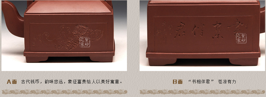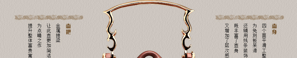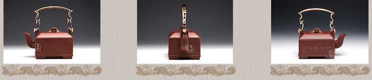 壶通体透析着紫砂本色的深紫红色,雍容华贵的色彩,散发出浓郁的东方艺术风韵,辅以金属的提梁给人一种高尚富贵之感,紫砂与金属的碰撞,更是一次创新与传统的交锋,作者不仅做到了,更以高超的工艺给了大家一个完美的解答,风雅之气,古朴历史倾入心间,雅俗共赏。
