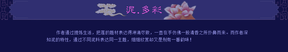 段泥:产于江苏省宜兴黄龙山,原矿外观近白色,夹深绿斑点;除可当泥胚制陶外,亦可磨筛成细颗粒,作为调砂效果之用。烧成后呈次鹅黄色,略含极少数红色斑点。而用段泥制作的《宝莲》清新幽雅,诠释了莲的圣洁与高雅。