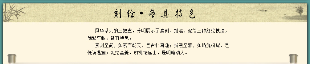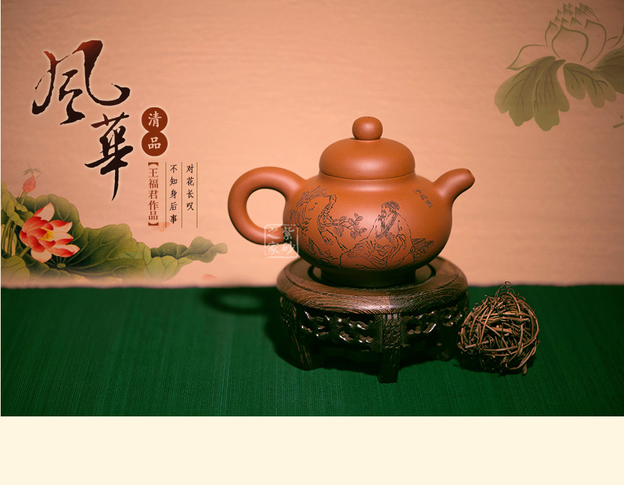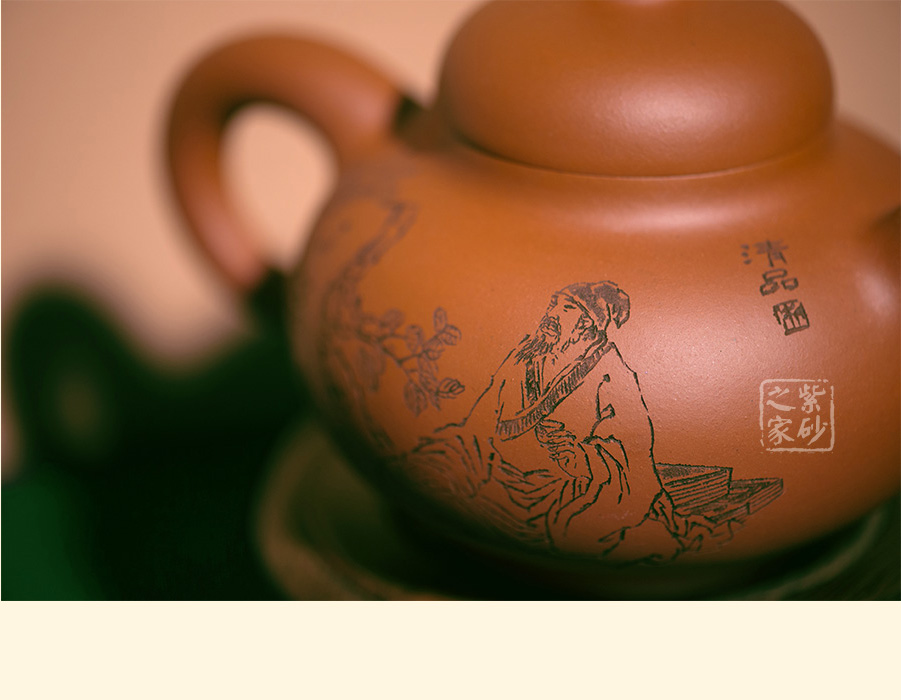 描黑刻绘的诗词“一杯春露暂留客,两腋清风几欲仙”道出了品茶真味,背面的居士品茗图,线条自然,人物生动,俨如一幅素描画,正合"清品"二字。