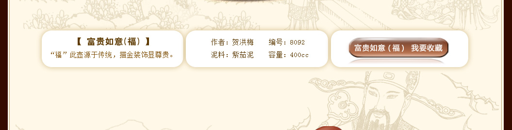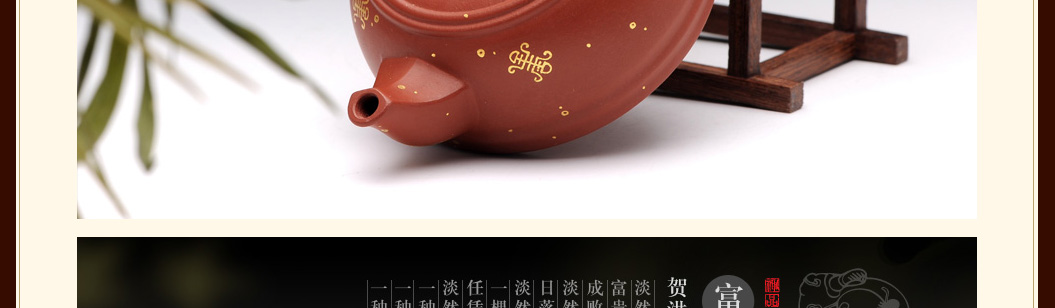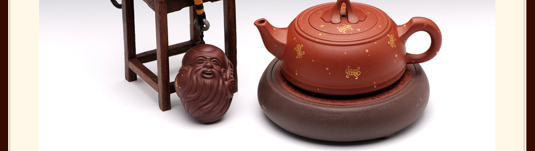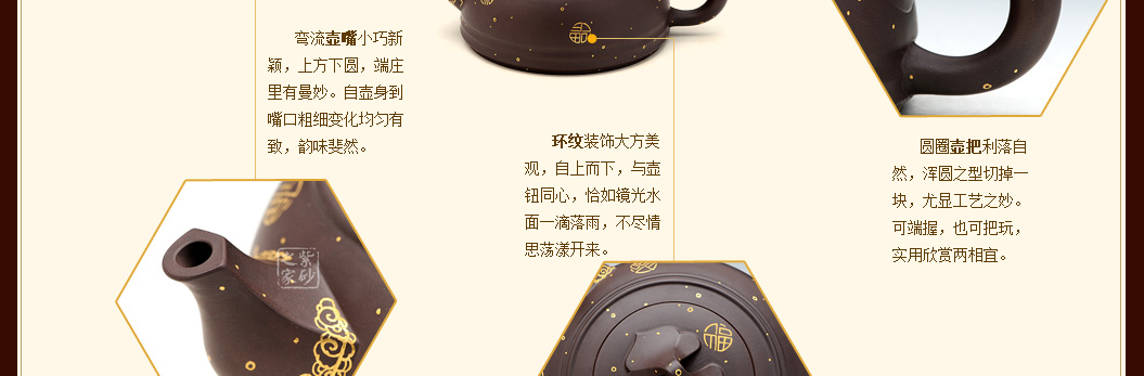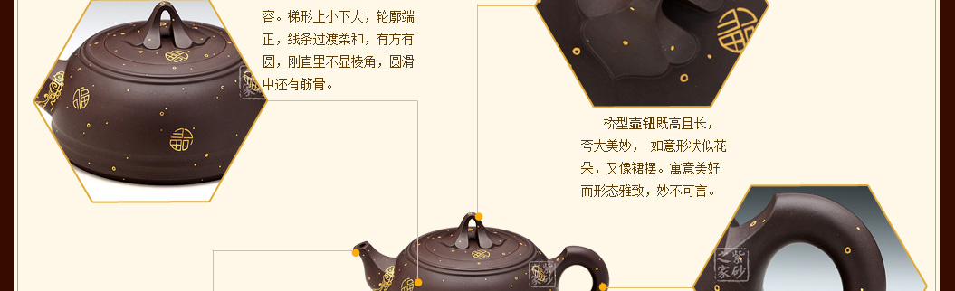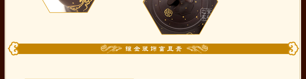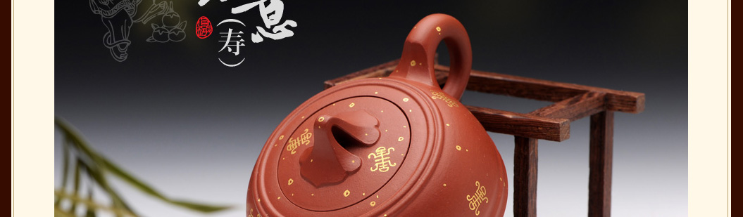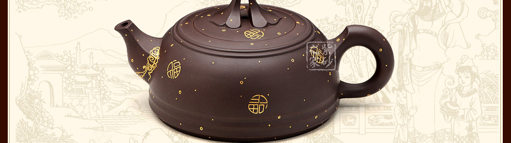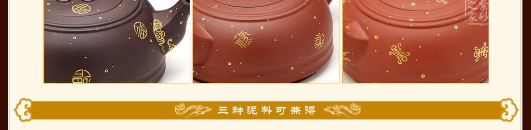 富贵如意三把壶分别以金丝镶嵌“福、禄、寿”三种字,又点缀以大大小小的金色斑点,配以醇和厚重的泥色,华贵高雅的气息喷薄而出,尤其能彰显个人身份和品味。